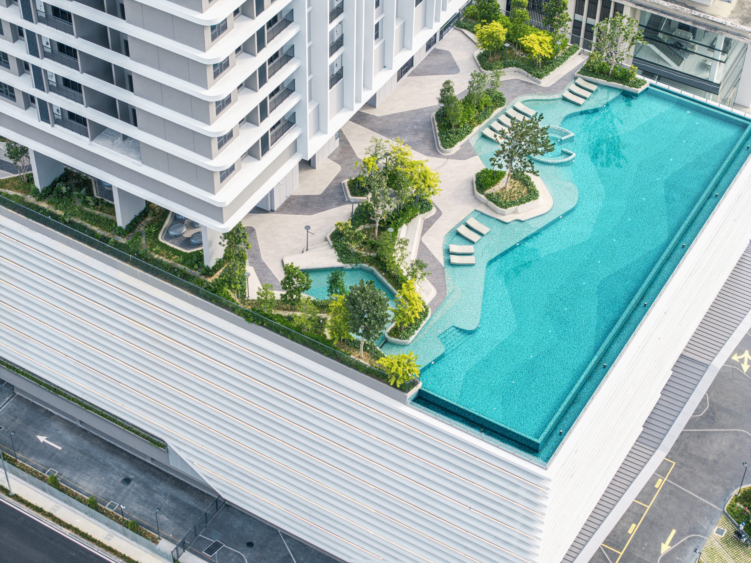 The Jacuzzi is strategically placed at the edge of Level 20 Sky Veranda, connecting its water surface visually with the skyline and city view below.