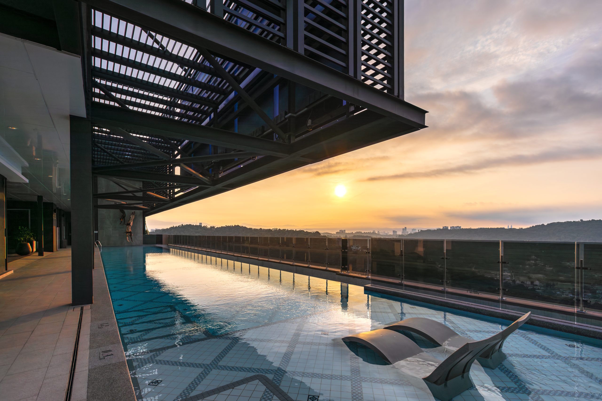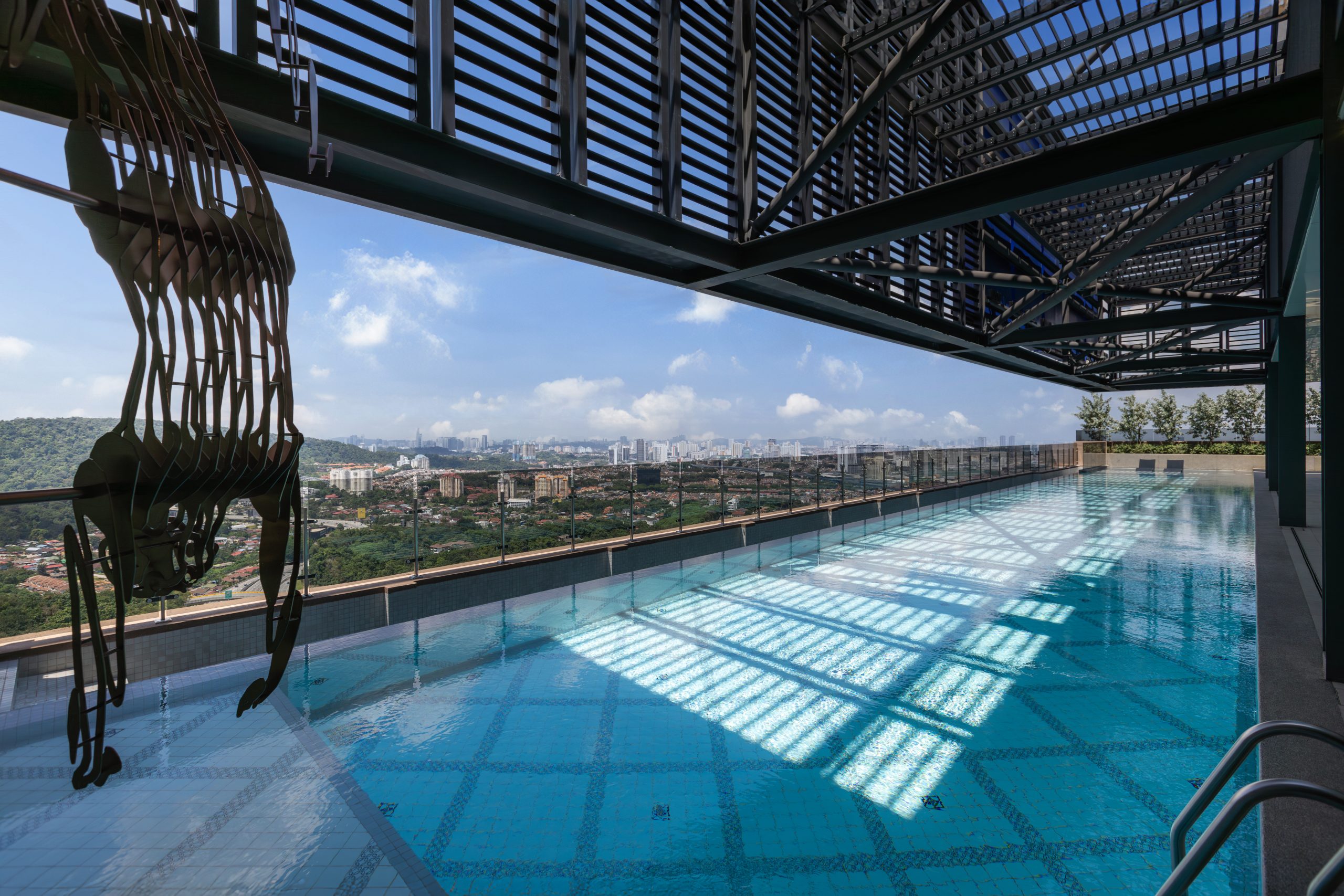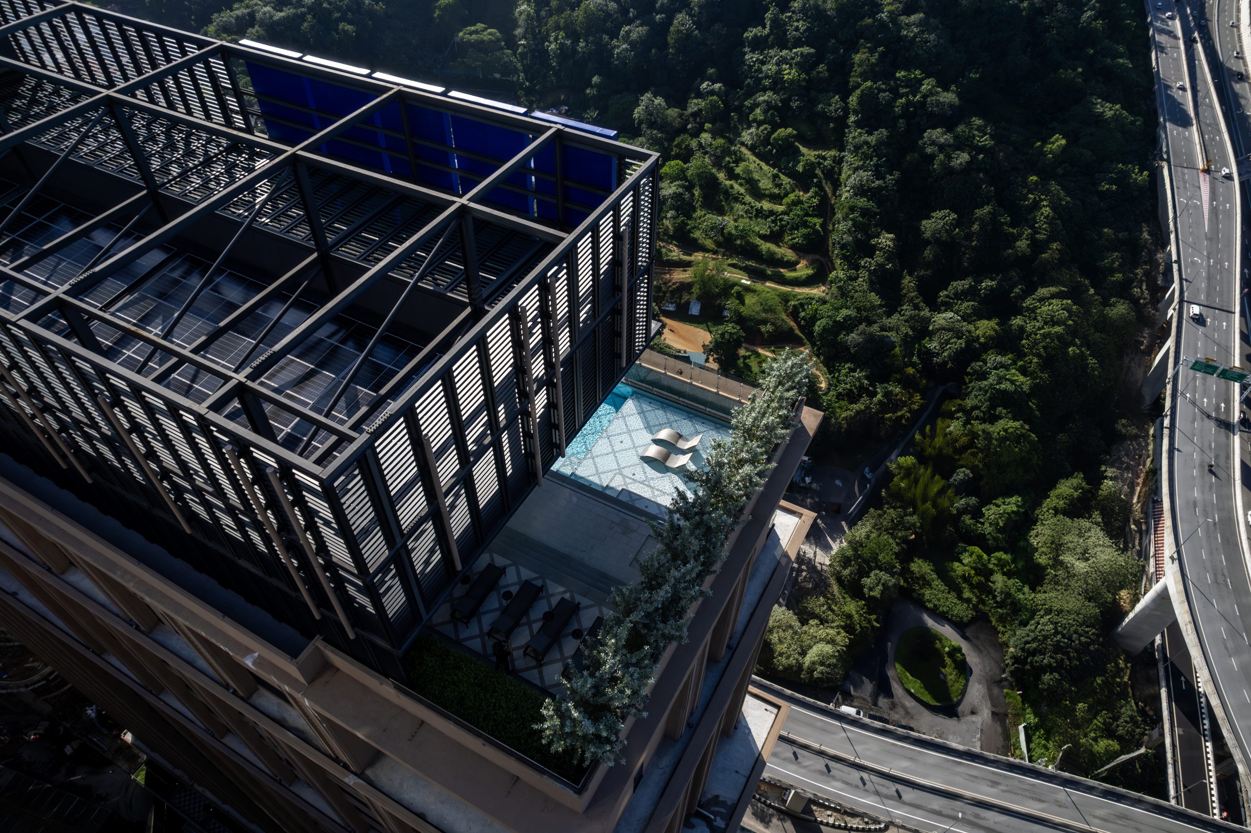 Suspended above forested slopes and intersecting highways, the rooftop infinity pool captures shifting light and expansive city-hill panoramas. Sculptural accents, patterned water and layered greenery define a serene, elevated retreat that contrasts metropolitan intensity with calm, resort-like immersion high above Empire City.