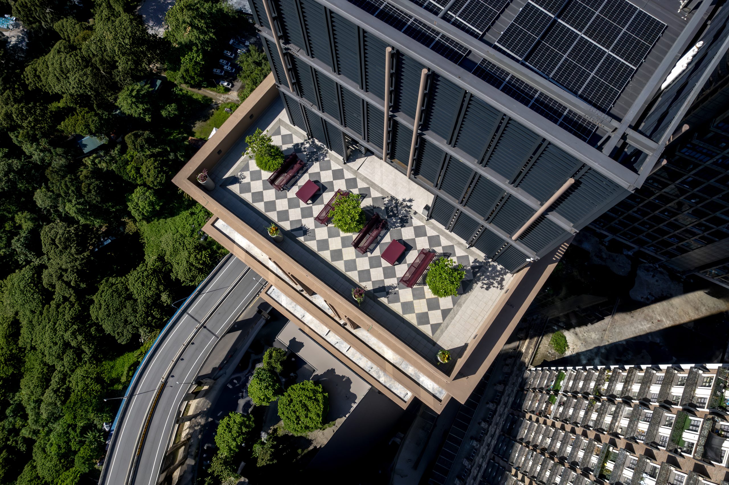 This elevated terrace features a refined outdoor lounge framed by patterned paving, sculptural planters and curated seating. Overlooking the city and forested edges, it offers a calm, sky-level gathering space where greenery, daylight and metropolitan views converge in a composed, contemporary setting.