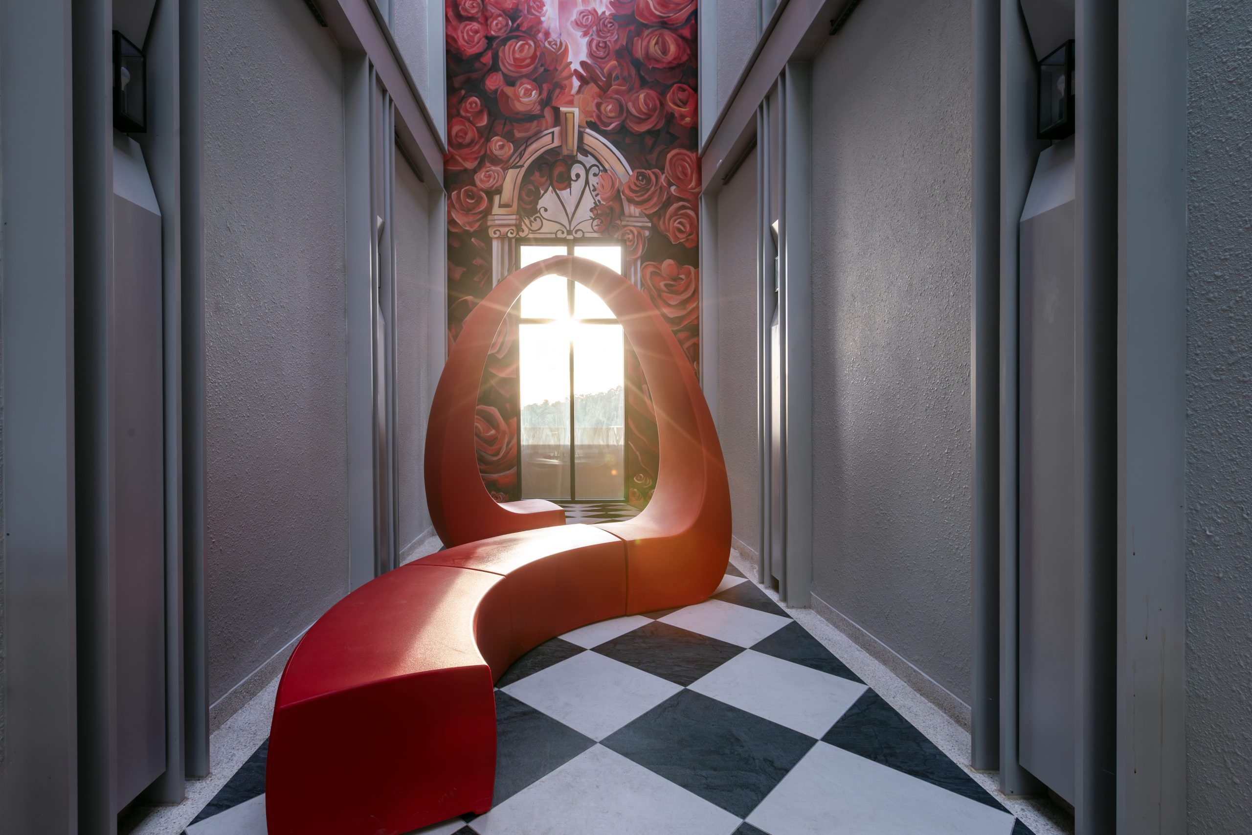 A striking, sculptural pause point offers a theatrical moment in the vertical journey where a sculptural red bench, rose-clad mural and checkerboard flooring converge. Sunlight frames the curved form, creating an intimate and artful spatial experience above the city.