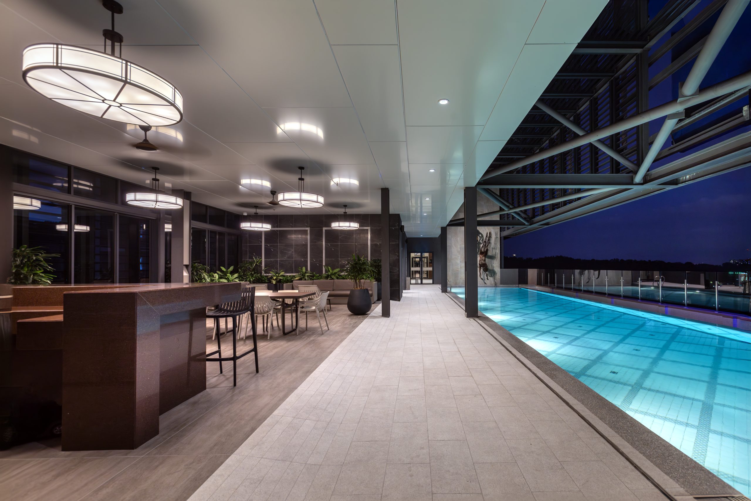 An illuminated rooftop oasis crowns the tower where the infinity pool, sculptural accents and sheltered lounge overlook sweeping city and hill vistas. By day or at dusk, patterned waters and refined detailing create a serene, luxurious retreat suspended above Empire City’s energetic skyline.