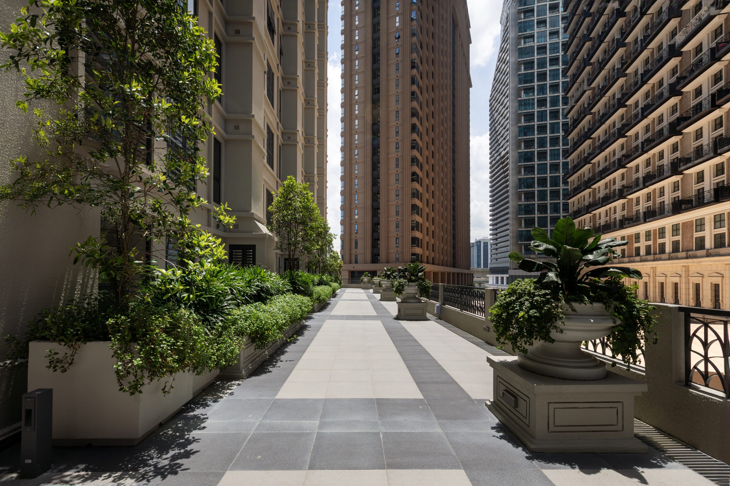 Rhythmic planting and refined hardscape detailing guide movement with clarity, creating a calm, well-ordered outdoor promenade elevated above the surrounding cityscape, defined by structured planters, classic urns and lush greenery to soften the corridor between spaces.