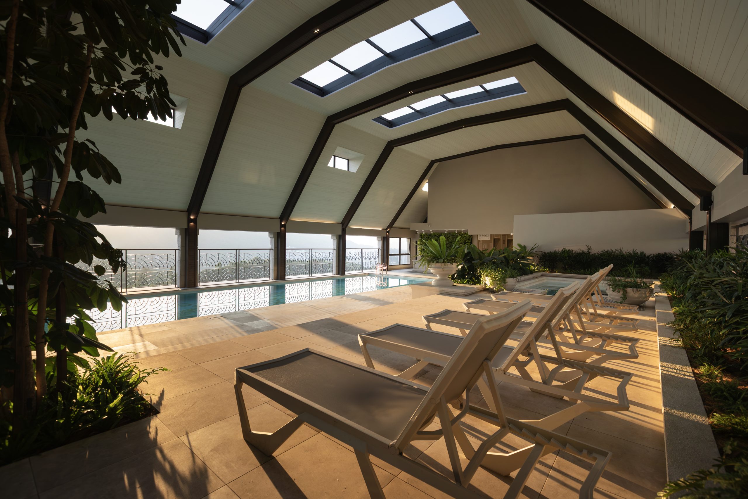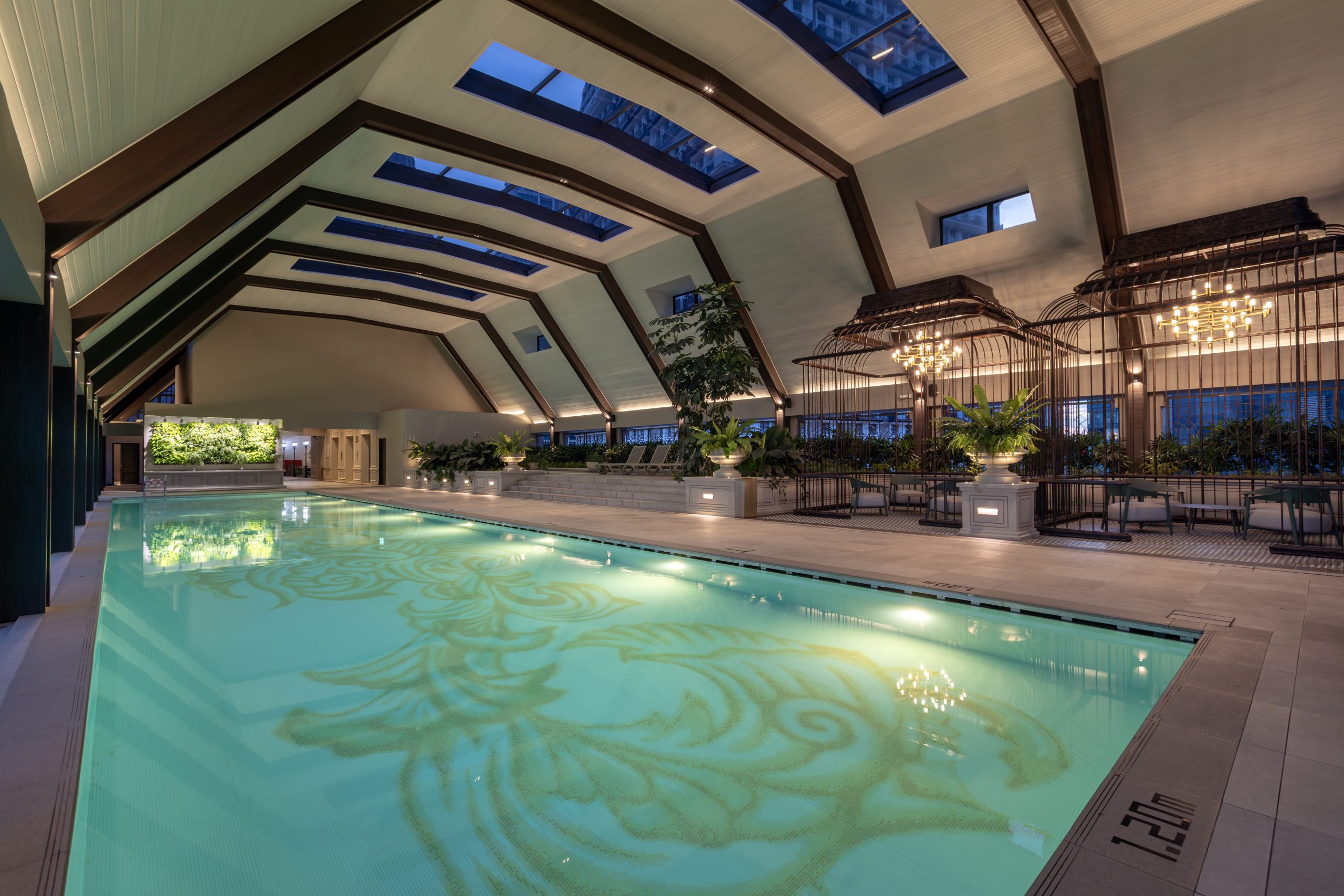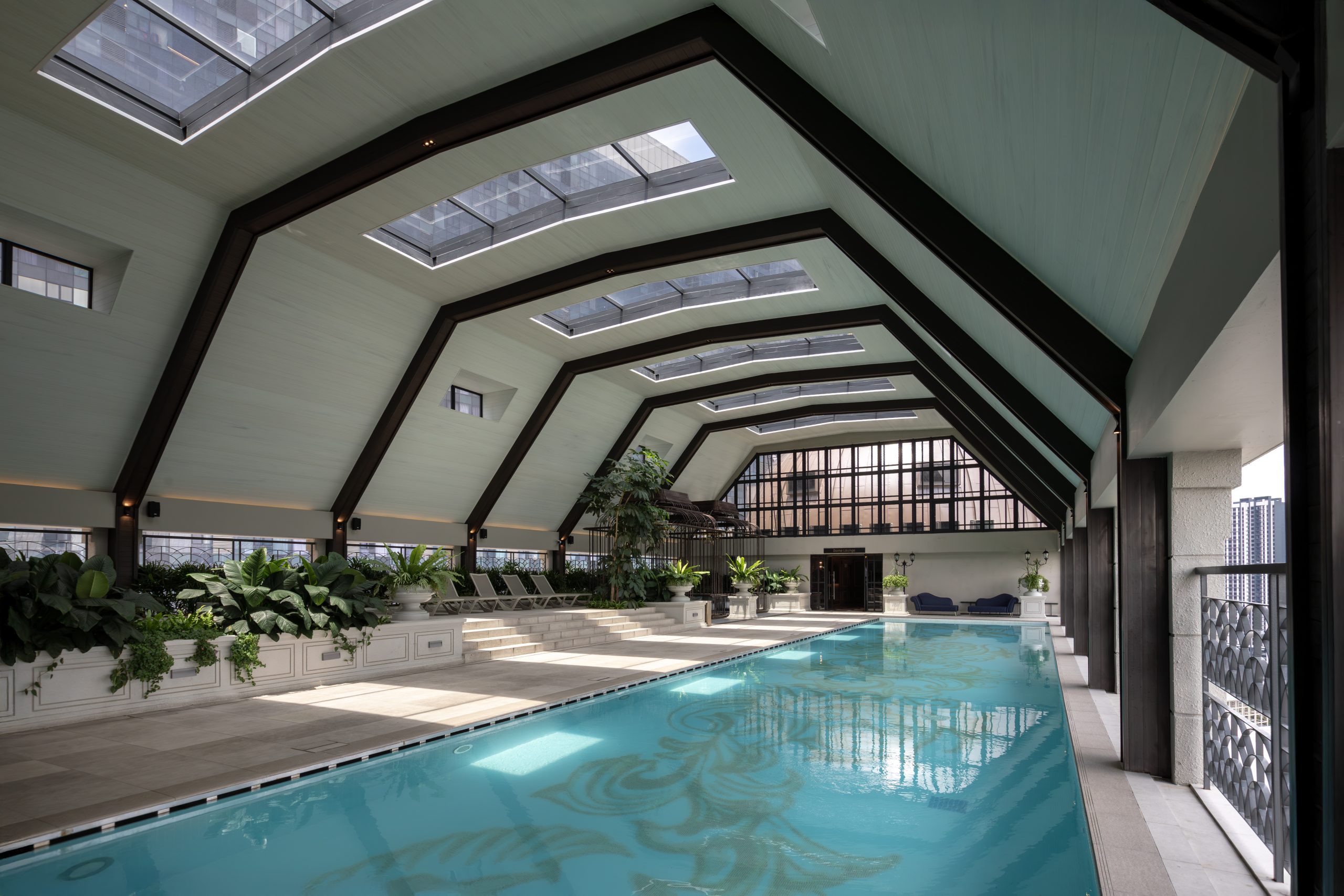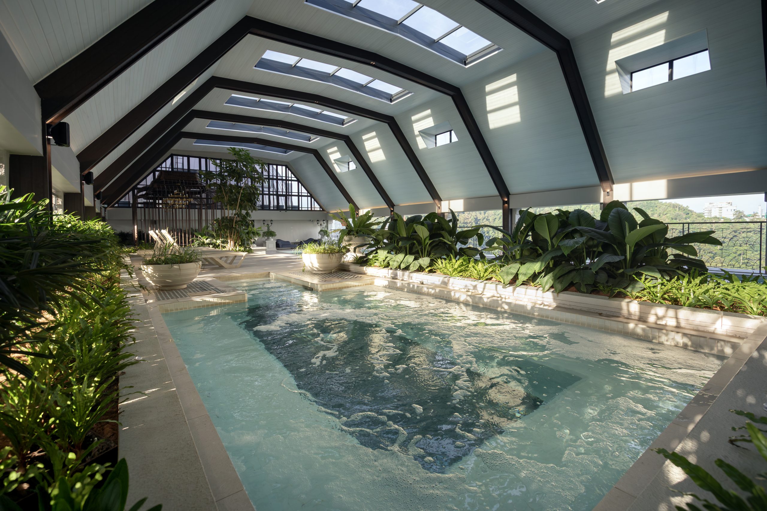 Light-filled pool deck framed by elegant structural lines and lush planting creates a calm, elevated atmosphere. Warm daylight filters through skylights highlighting textured water surfaces, sculpted planters and spacious lounging areas that provide refined comfort and a tranquil sensory environment above the city.
