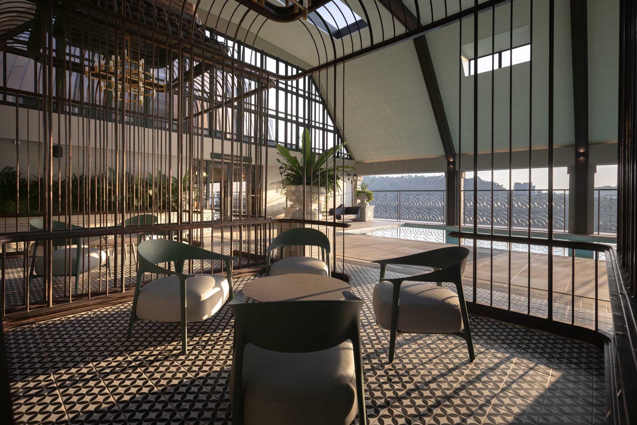 Featuring Victorian-inspired metalwork, classic plinth planters and patterned flooring creates an elegant garden setting. Curated greenery softens the structure while refined seating clusters provide a composed social space overlooking the pool and surrounding landscape.