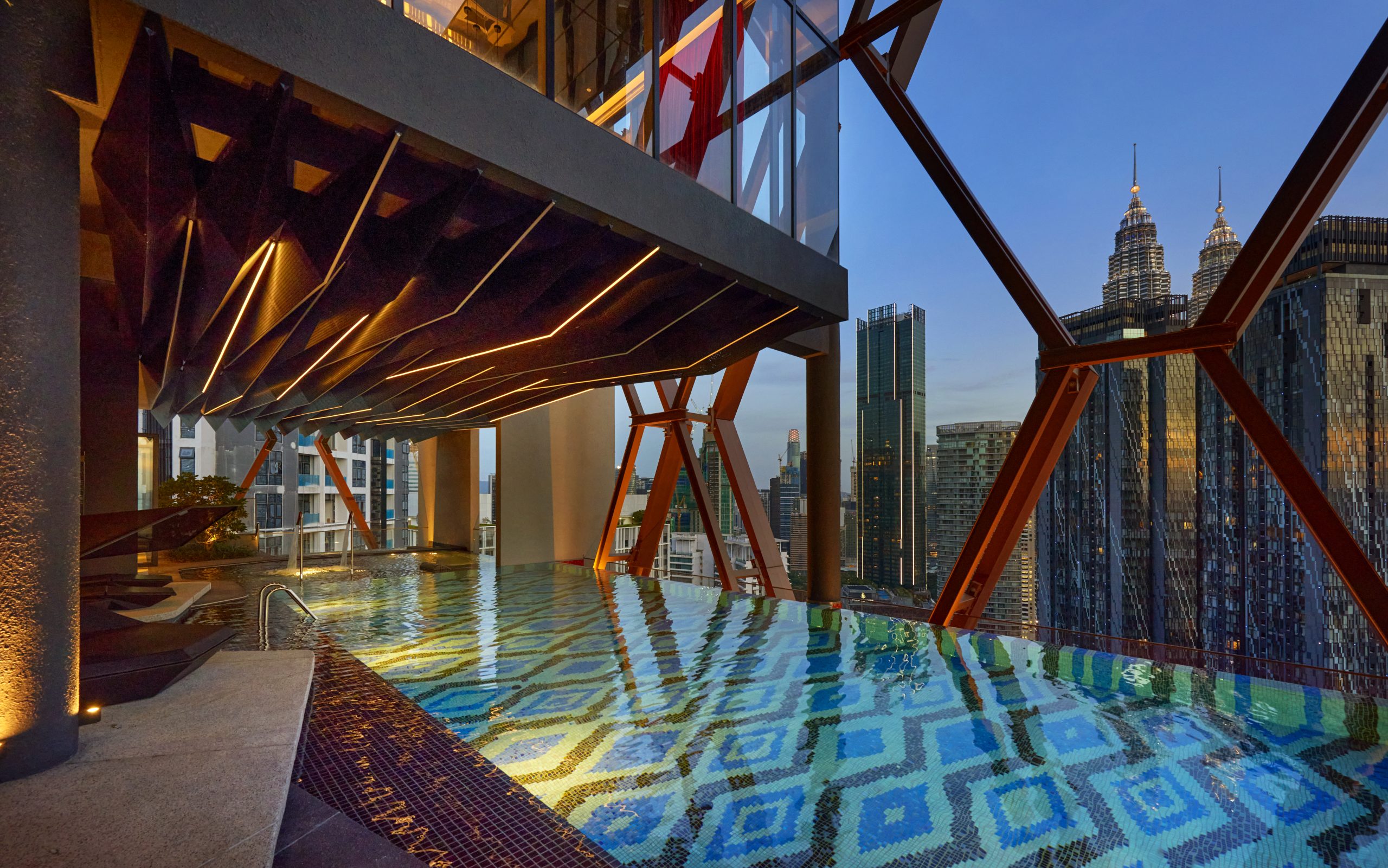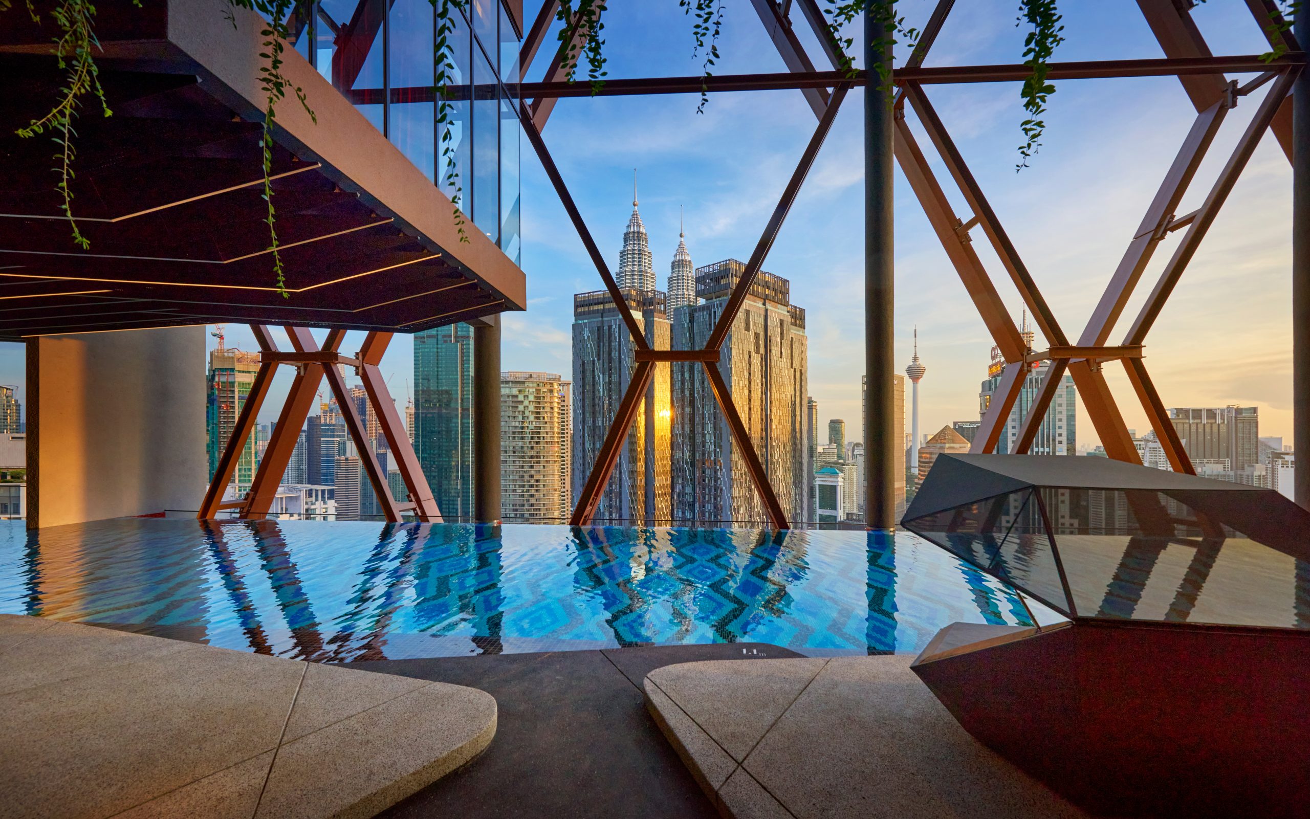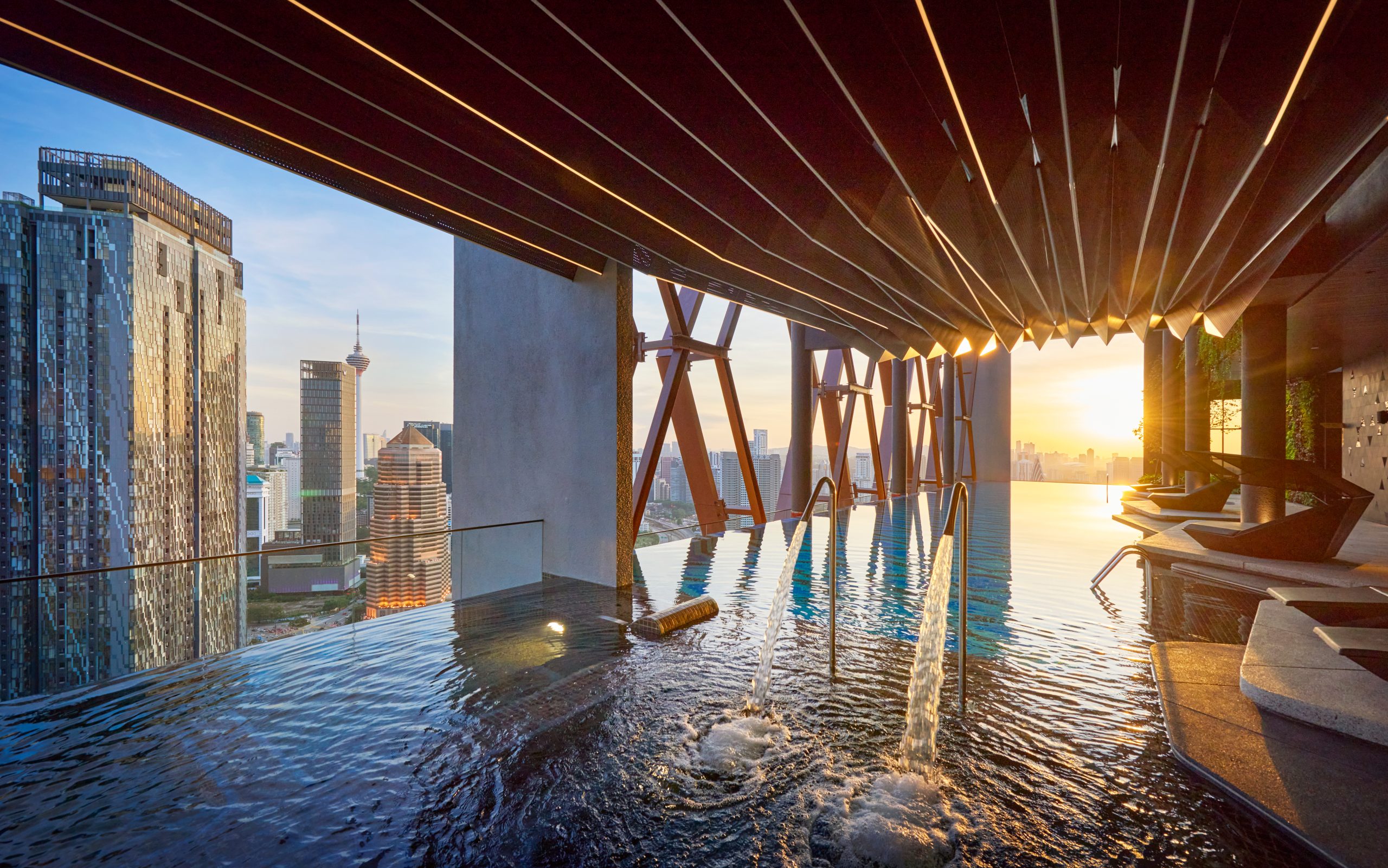 The sky at dusk against the Pool Lounge on Level 47 creates the illusion of a luminous landscape that merges with the Kuala Lumpur skyline.