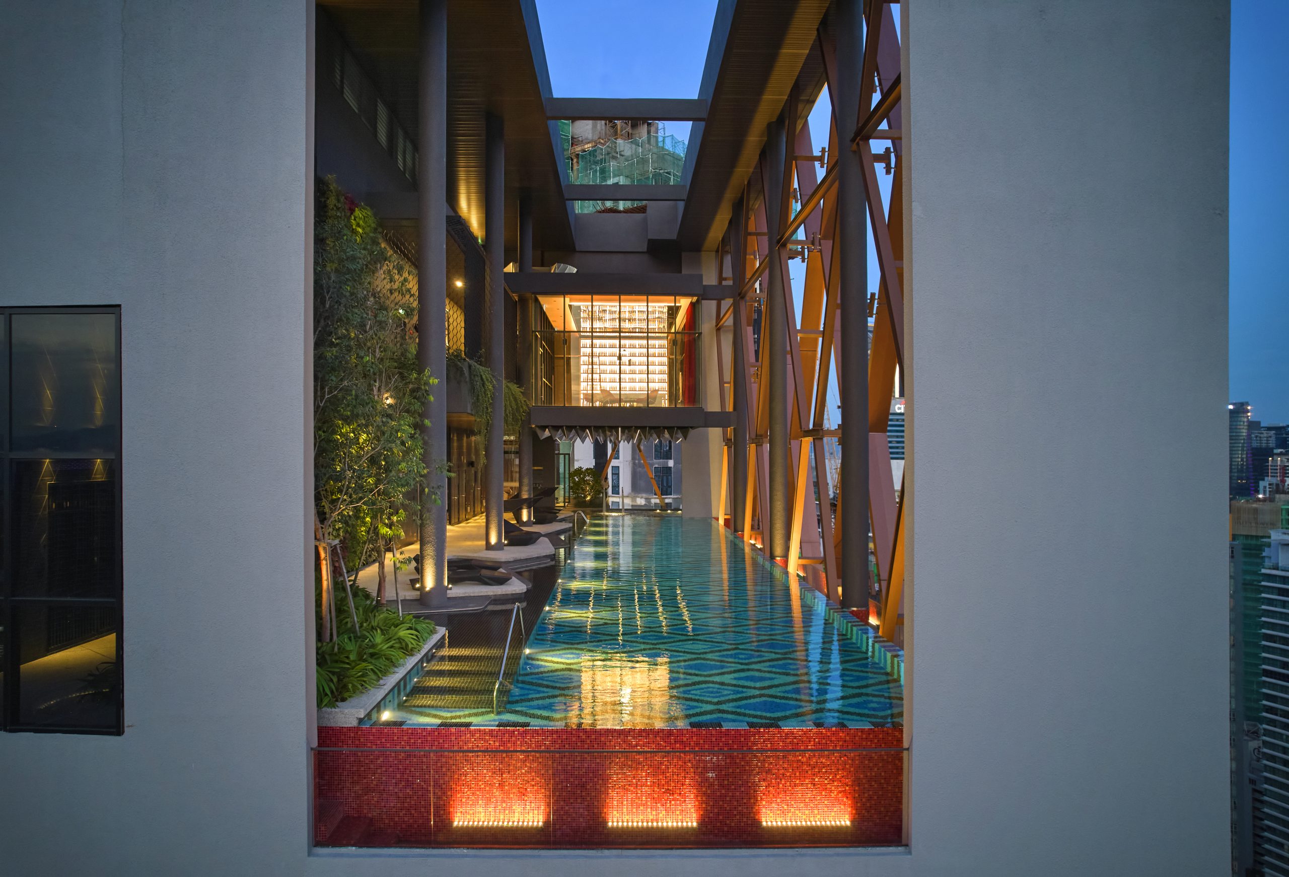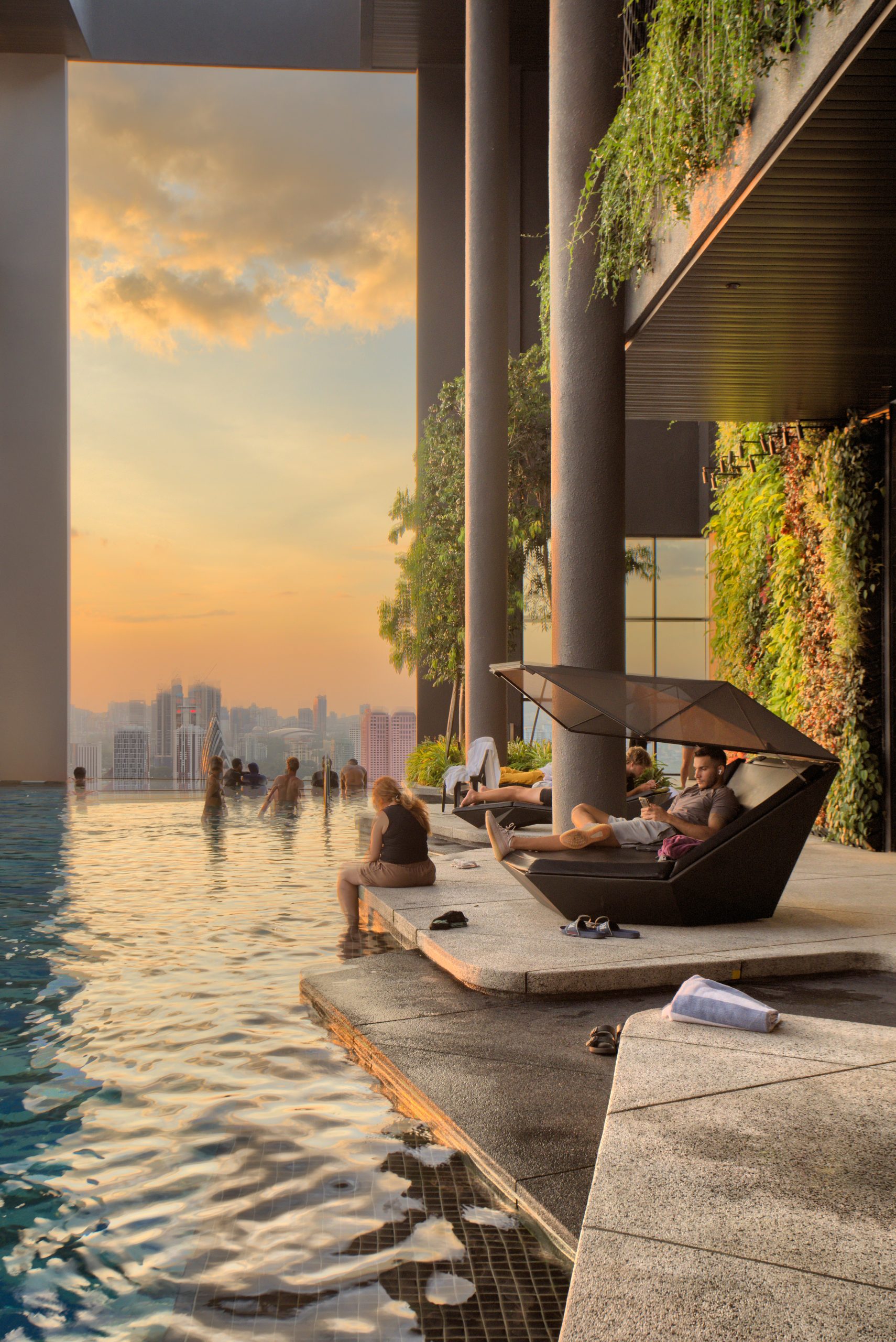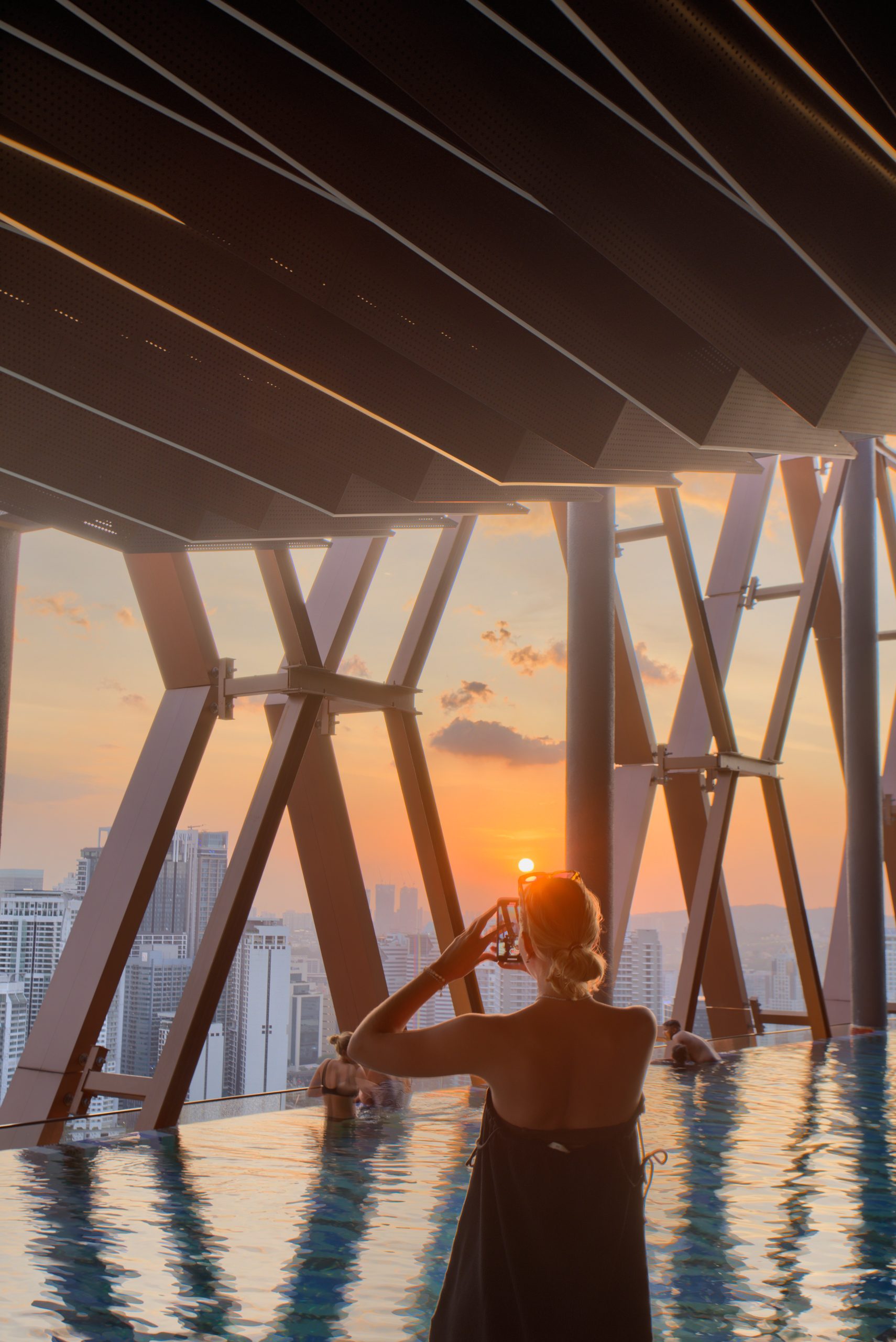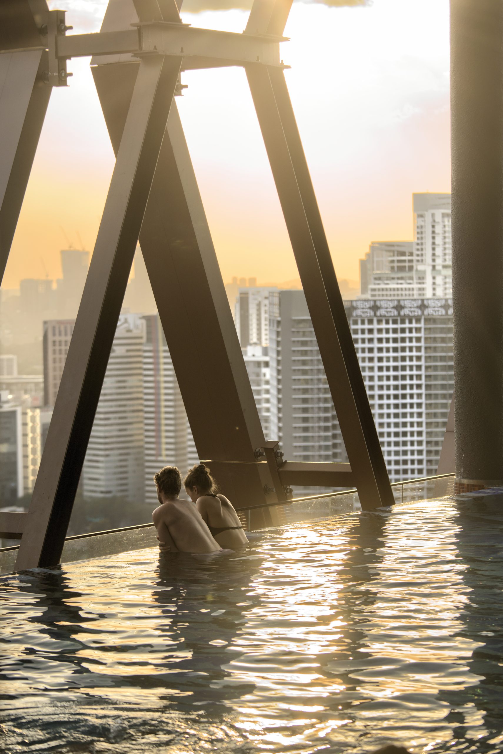 The sky at dusk against the Pool Lounge on Level 47 creates the illusion of a luminous landscape that merges with the Kuala Lumpur skyline.