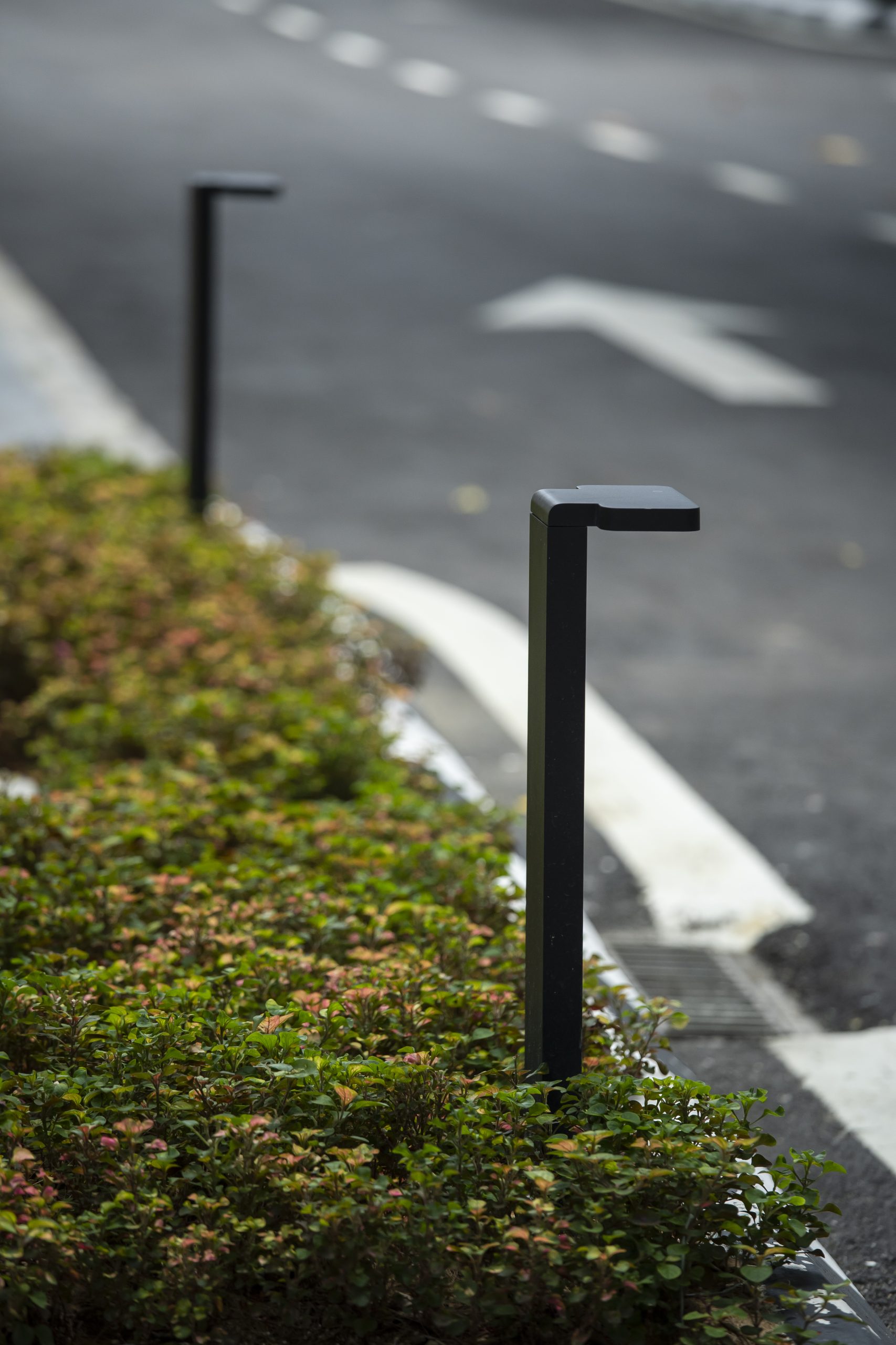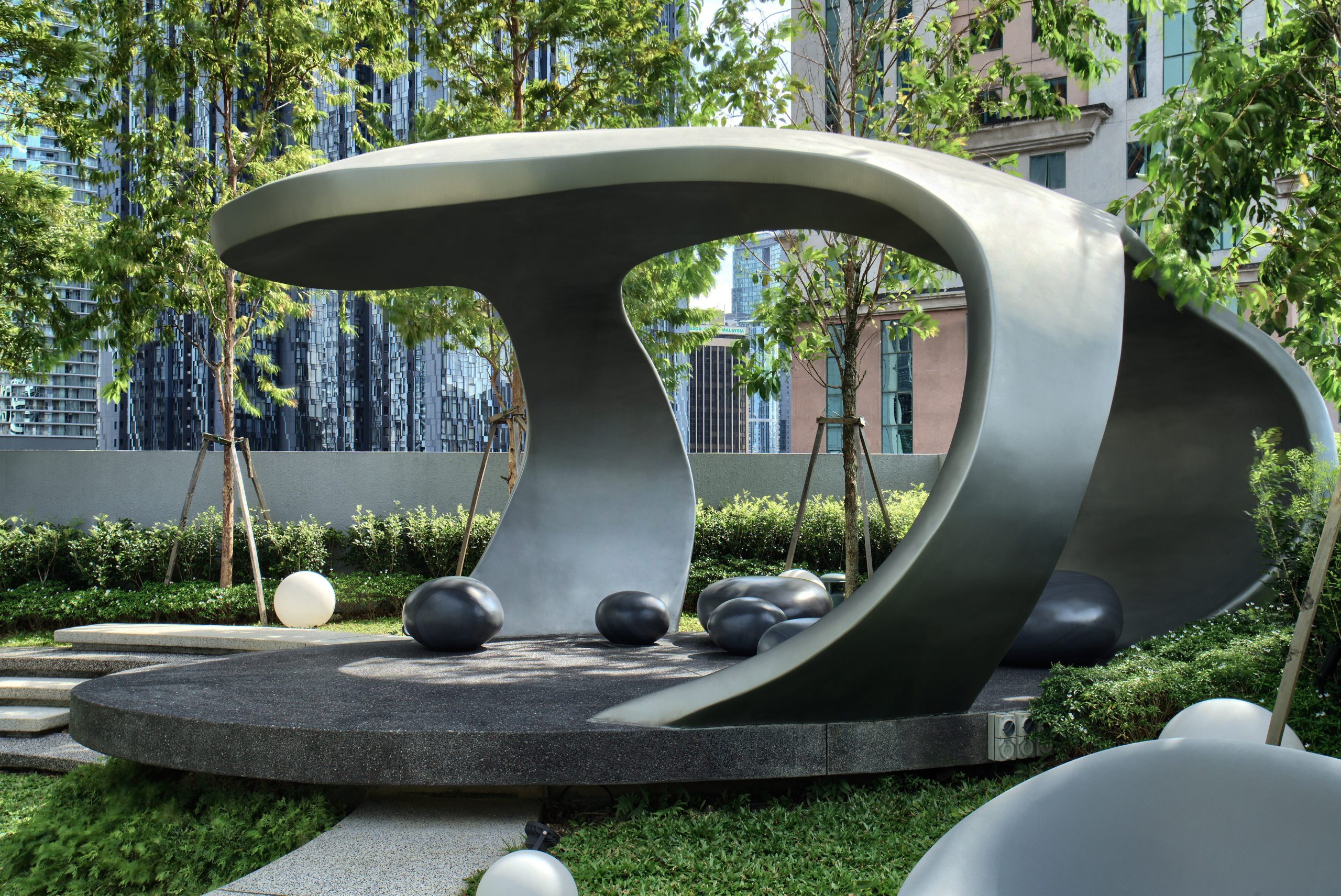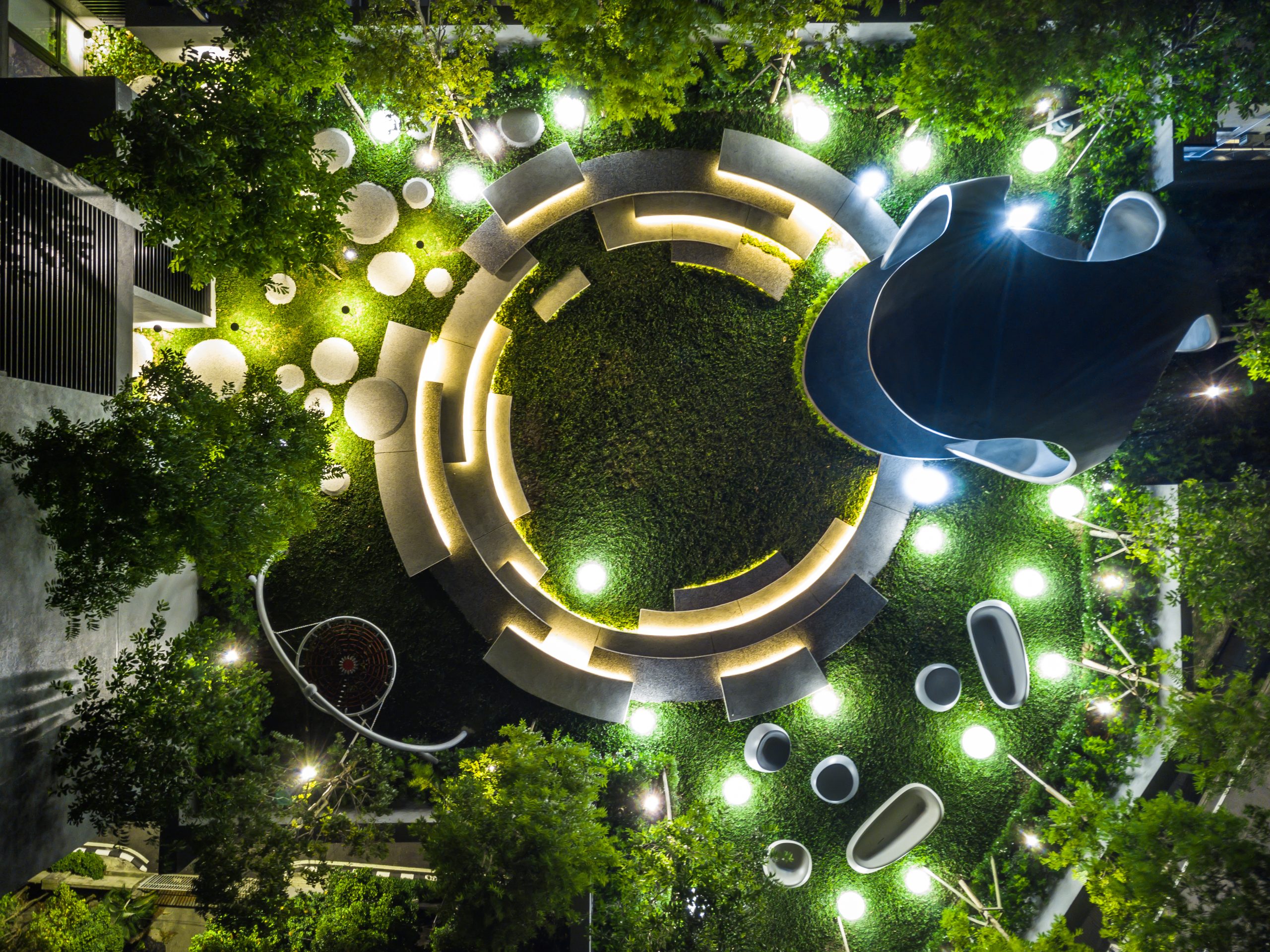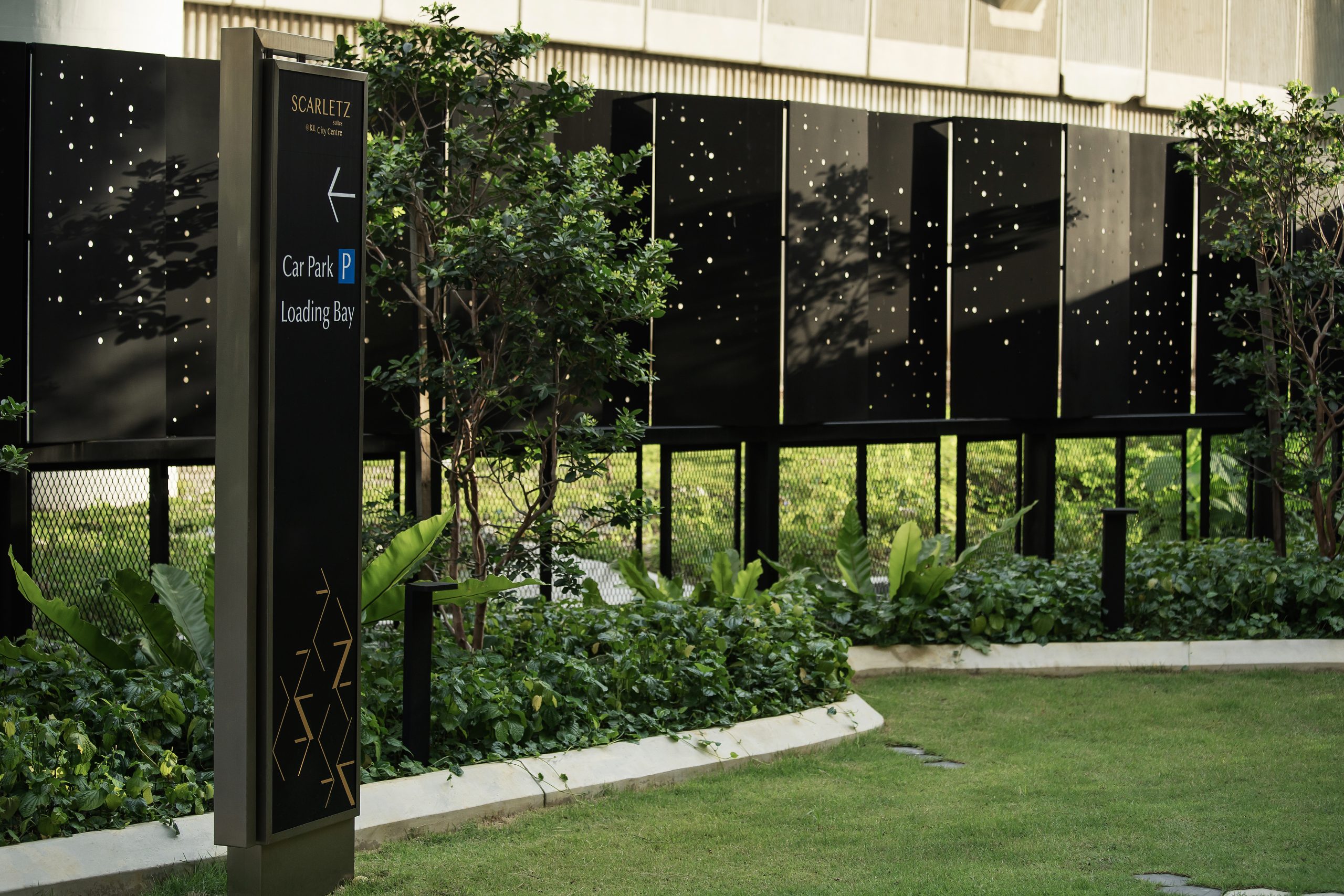 Wayfinding signages help visitors find their way and immerse themselves in the surroundings of the lushly landscaped garden, and the perforated panels glitter like a galaxy as the light permeates, creating a dynamic, energetic transitional passage.