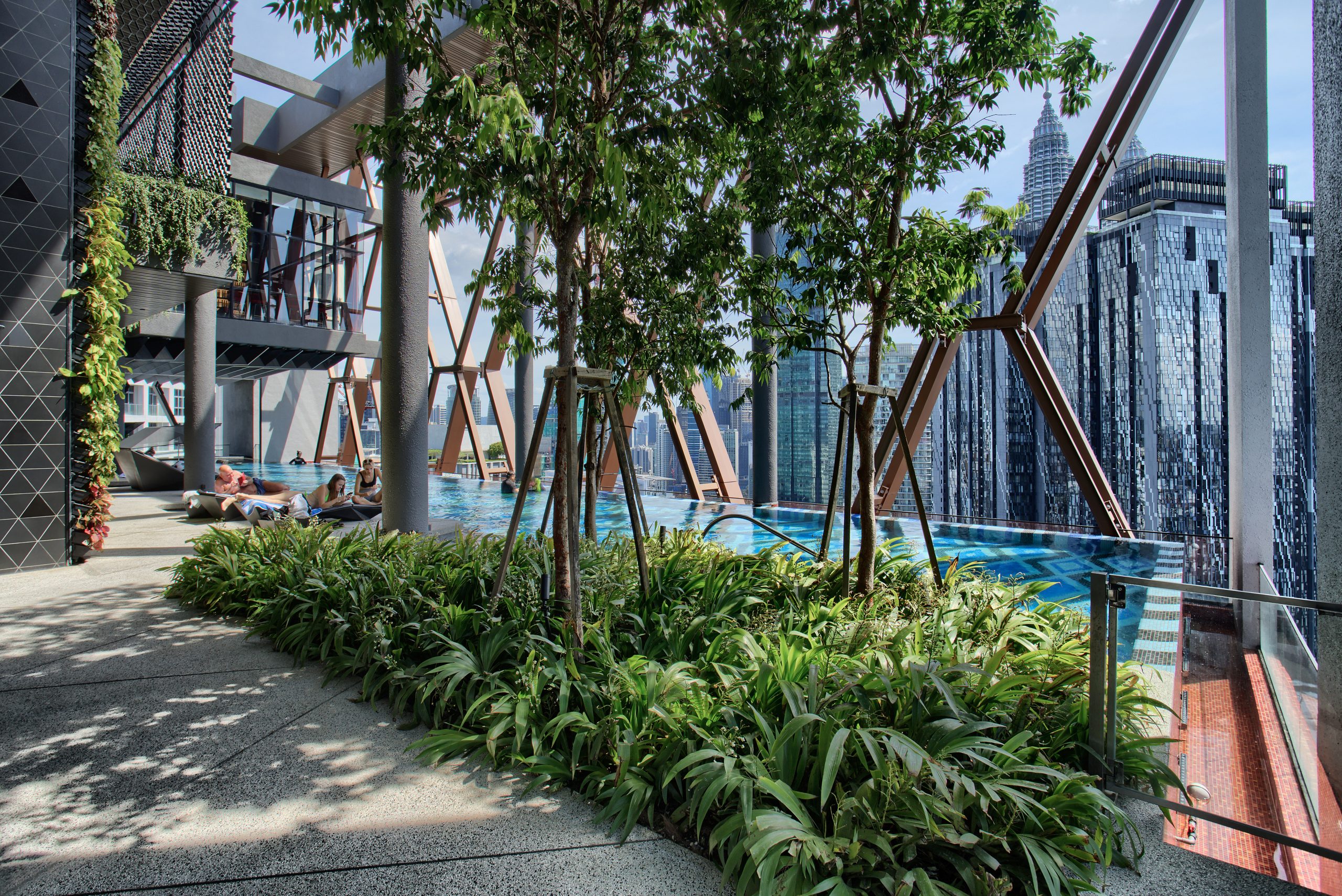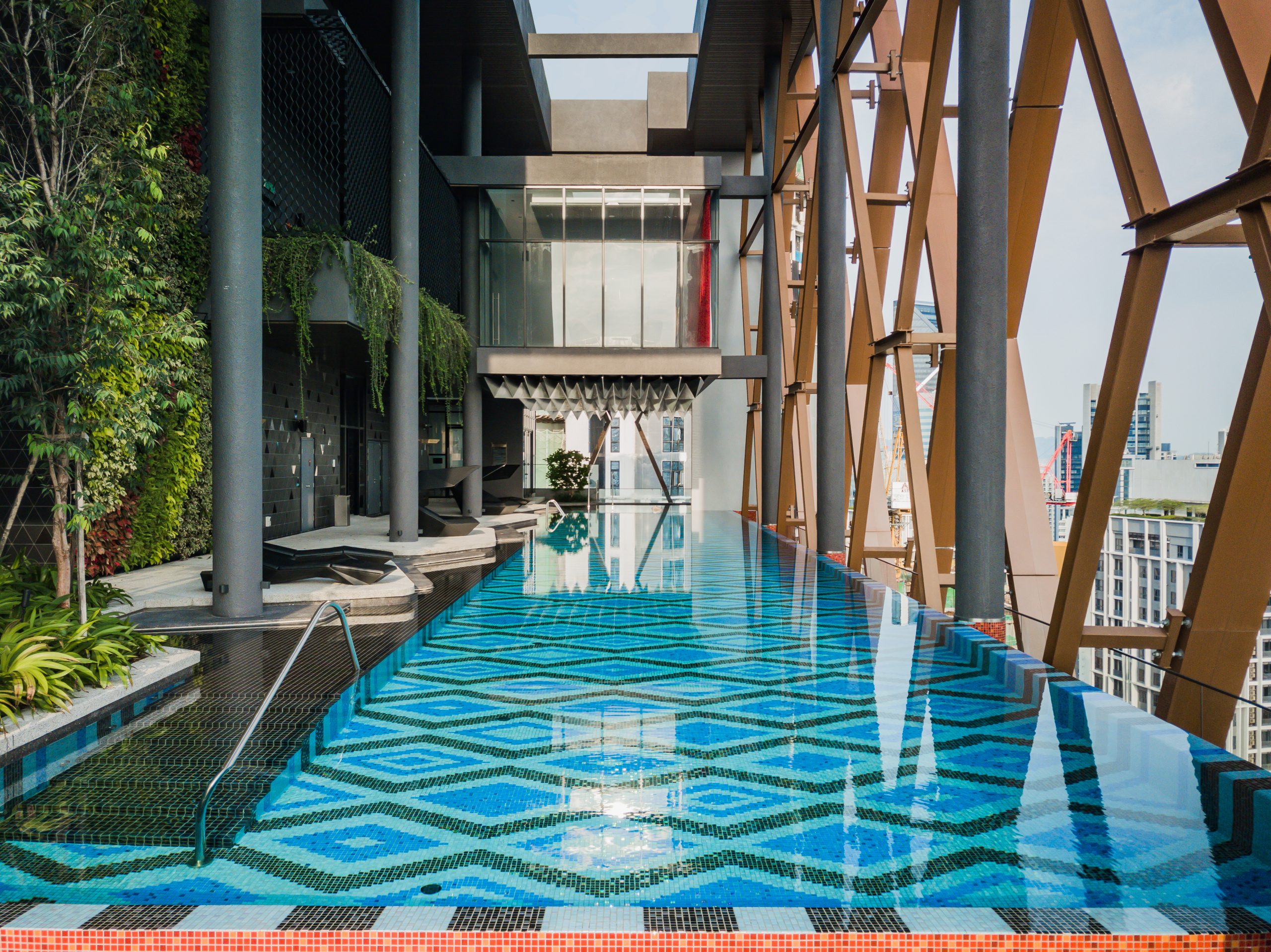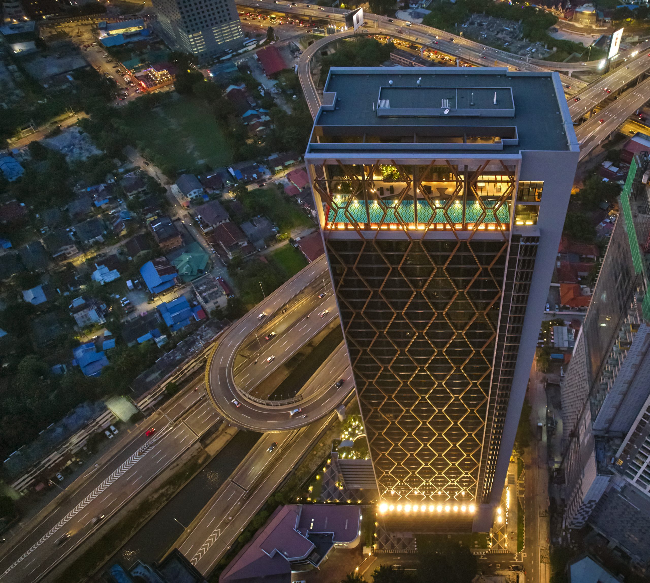 With unobstructed views of the city of Kuala Lumpur from the pool on Level 47, the integration of the building’s pool tile design and facade cladding creates a seamless connection between indoor and outdoor spaces, landscape elements and architectural components.