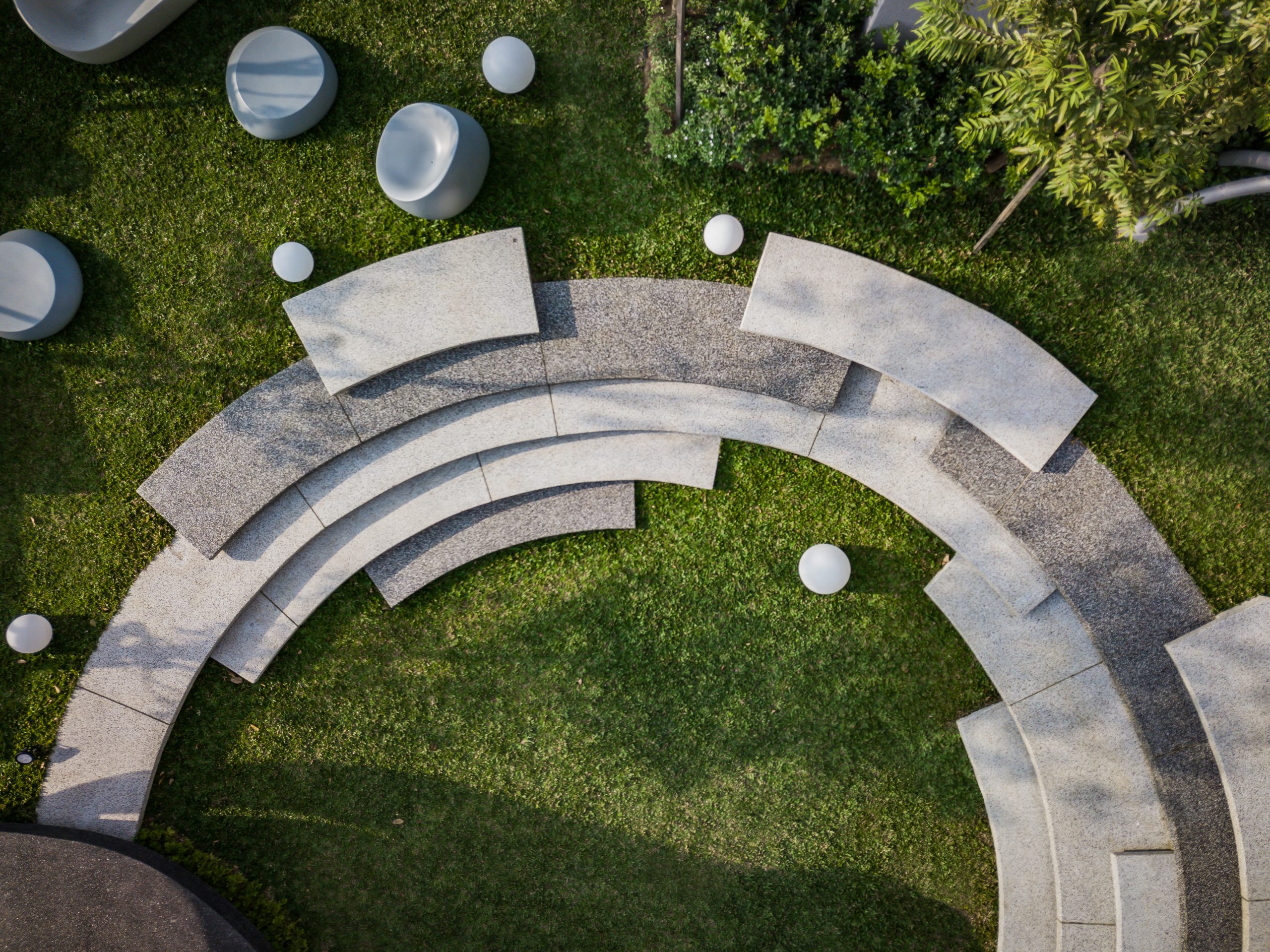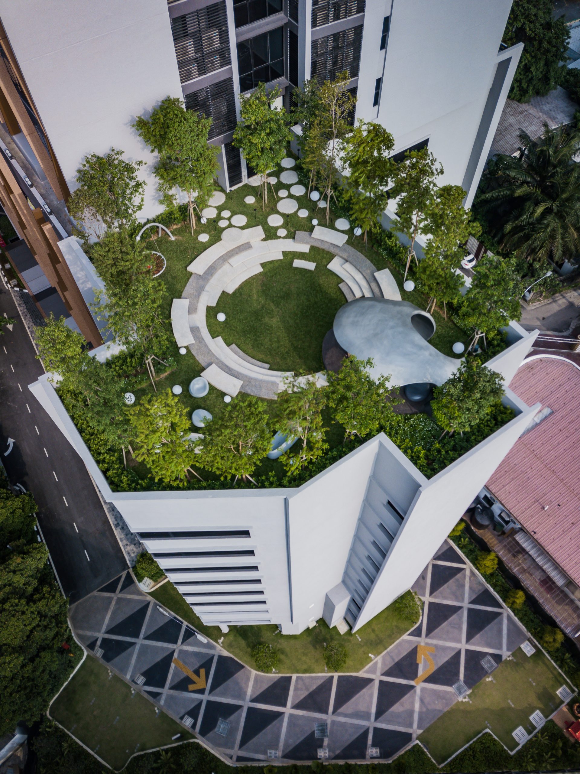 The Sunken Lawn on Level 8 remains predominantly open to the sky and offers a green and vibrant landscape towards the street. Trees planted along the parapet walls provide shade and thermal comfort. Meanwhile, the specification of planting with native plants ensures maximum adaptation to the local climate with minimal maintenance. They create a communal space with a fluid spatial planning for the garden and amenities such as a playground for children, a swing and cosy lounge areas that cater to different groups and zones.