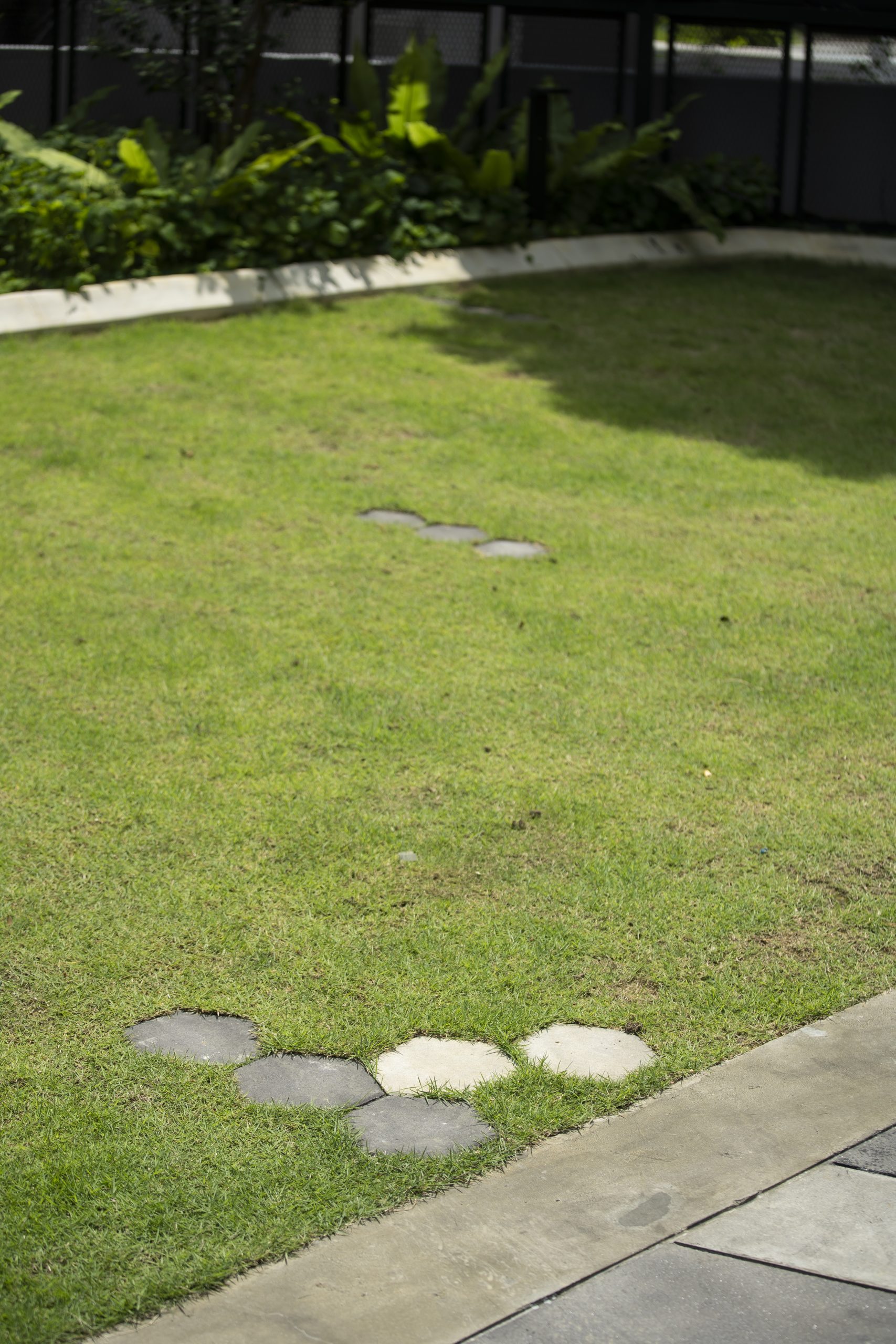 Concrete paving stones on the lawn, deliberately laid randomly yet interestingly, attractively enhance the green space.