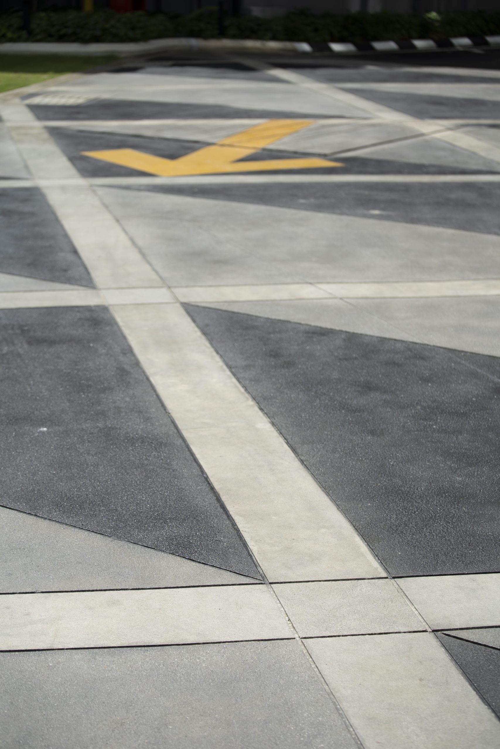 Yellow road paint colour and concretes for visual aesthetics enhance car park design and enable efficient traffic flow.