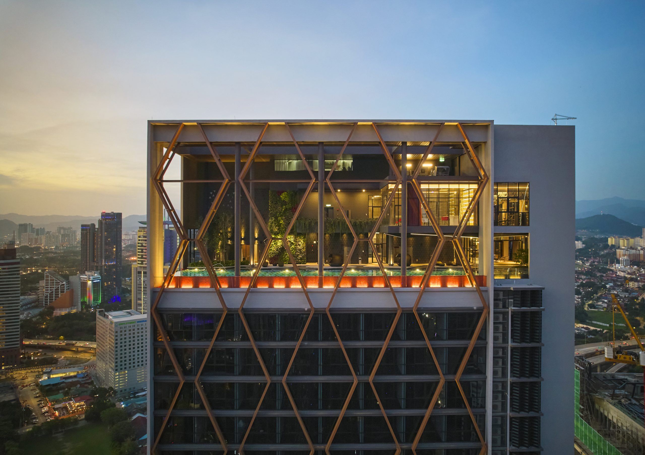 A dual key concept that integrates commercial and residential infrastructures, easing into the inner ring of Kuala Lumpur’s burgeoning urbanity and CBD (Central Business District). The building’s architectural facade screen was defined by a characteristic system of aluminium frame structures reminiscent of a piece of jewellery, an interlocking golden chain surrounded by the radiant beauty of the landscape.