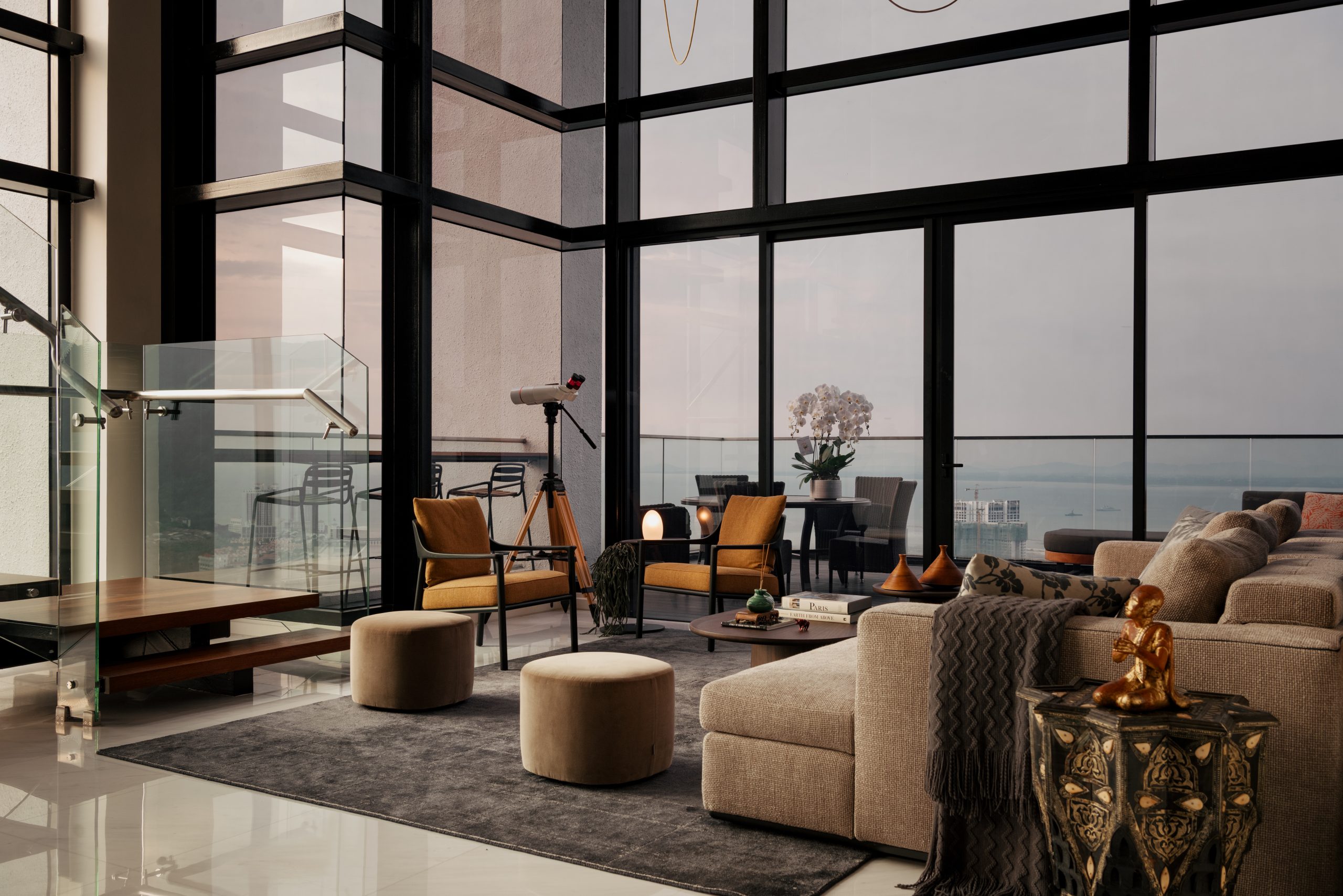 The lush outdoor setting provides inviting seating that transcends mere function, fostering intimacy, encouraging conversation and maximising space through thoughtful, well-crafted design framed by sweeping sea and city views. Warm sunset hues, gentle lighting and tactile furnishings create a tranquil retreat, seamlessly extending indoor comfort into the expansive horizon.
