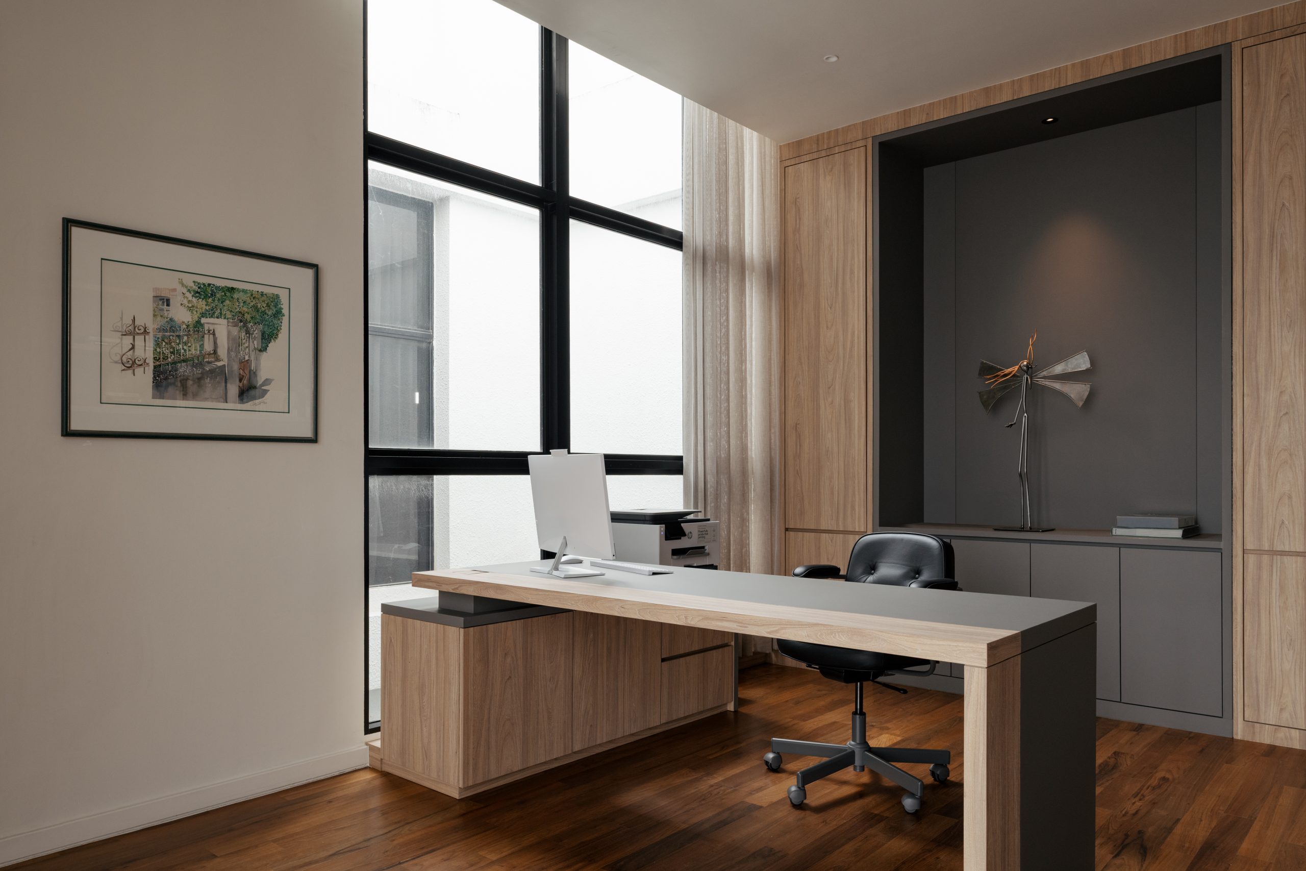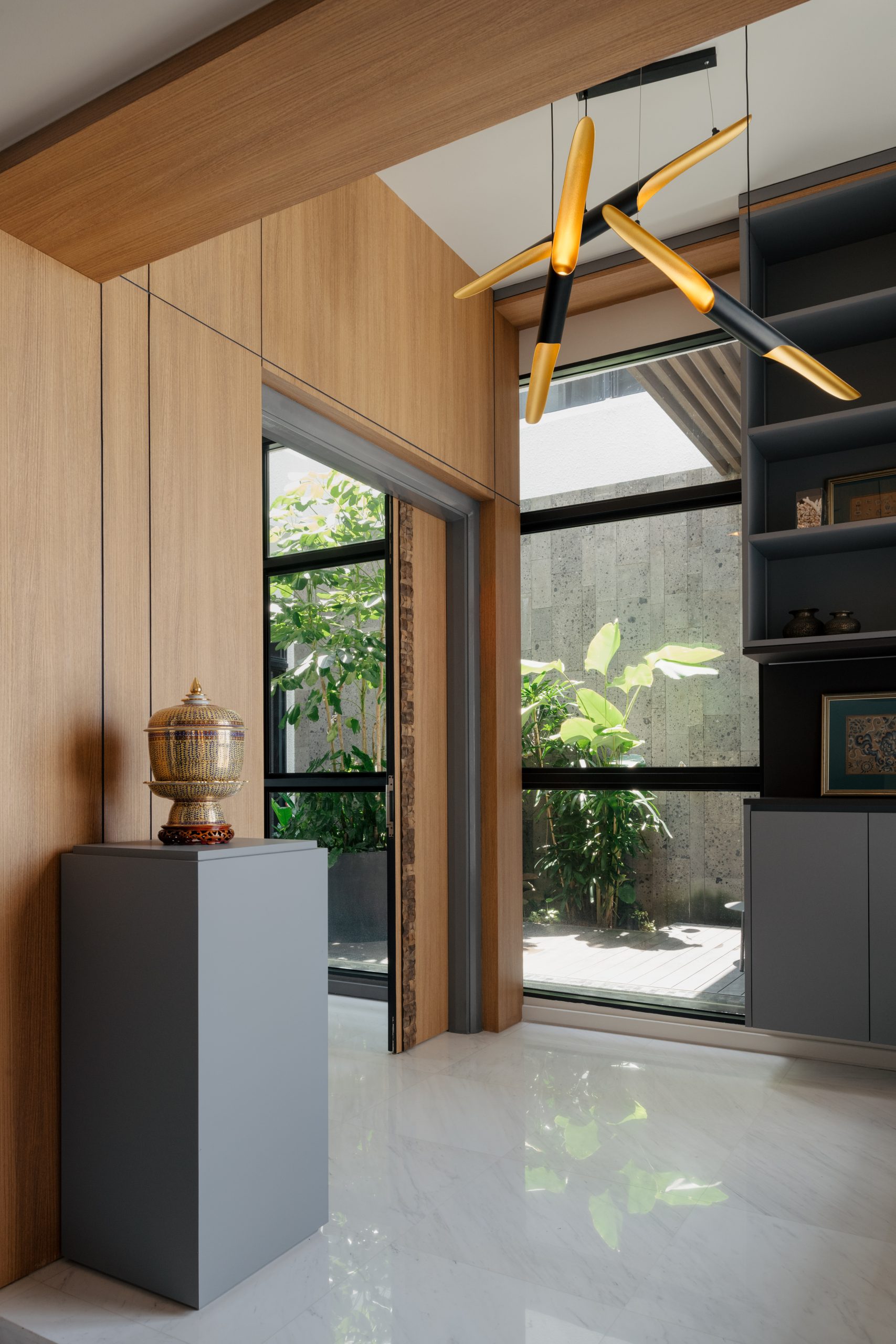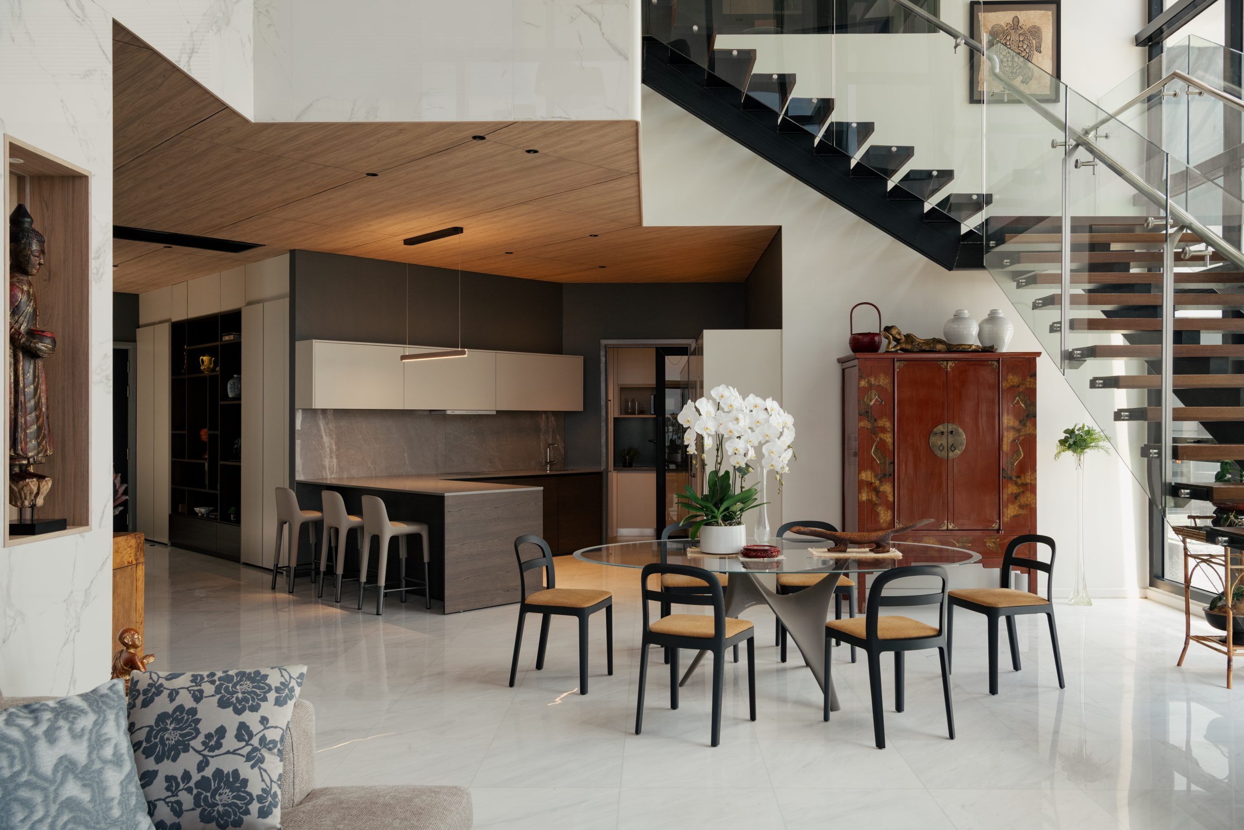 “Natural light filters through expansive glazing, highlighting the warmth of timber panels and sleek modern detailing. A sculptural pendant anchors the space with quiet sophistication, creating harmony between the space, people, and nature.” — Landart Interior
