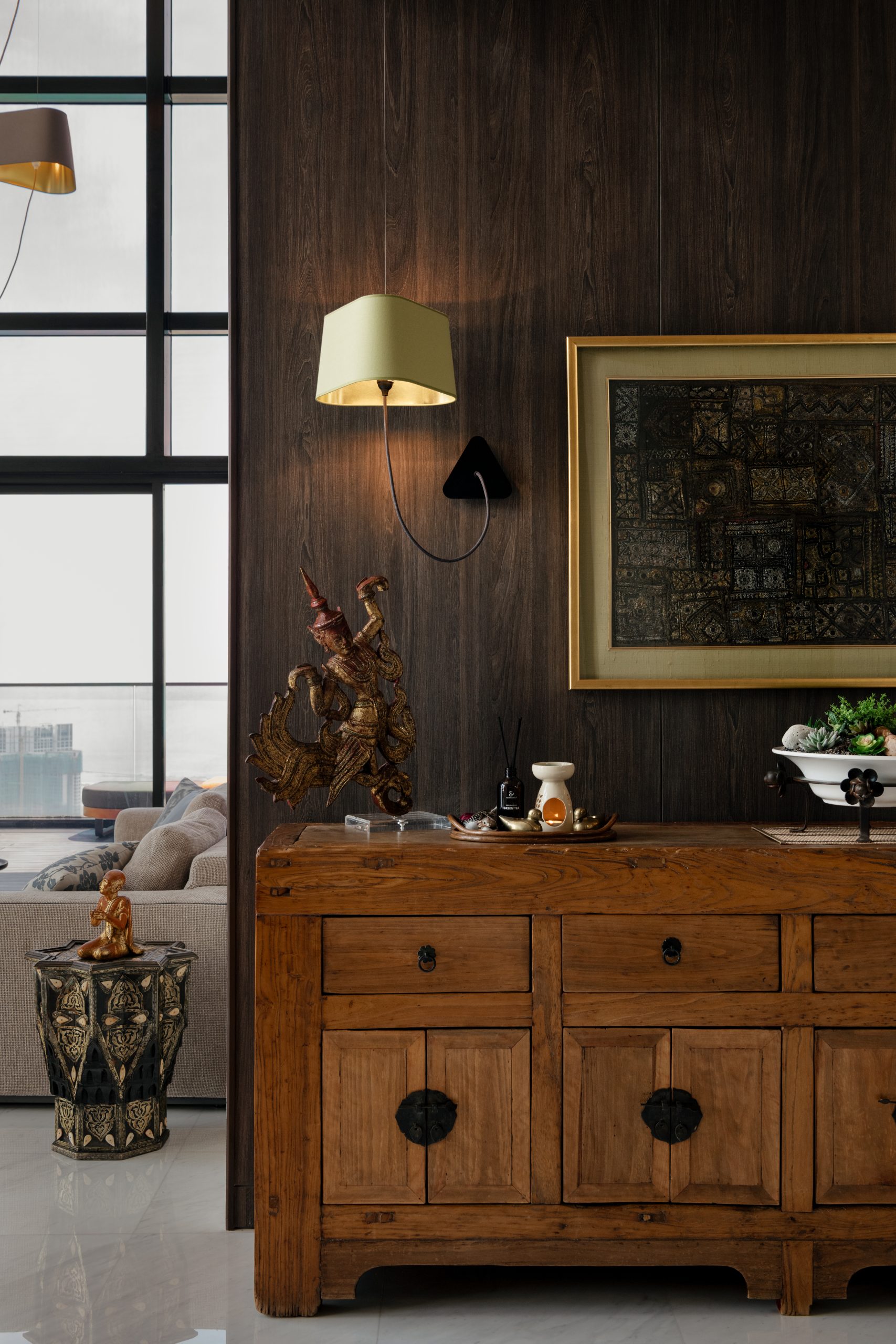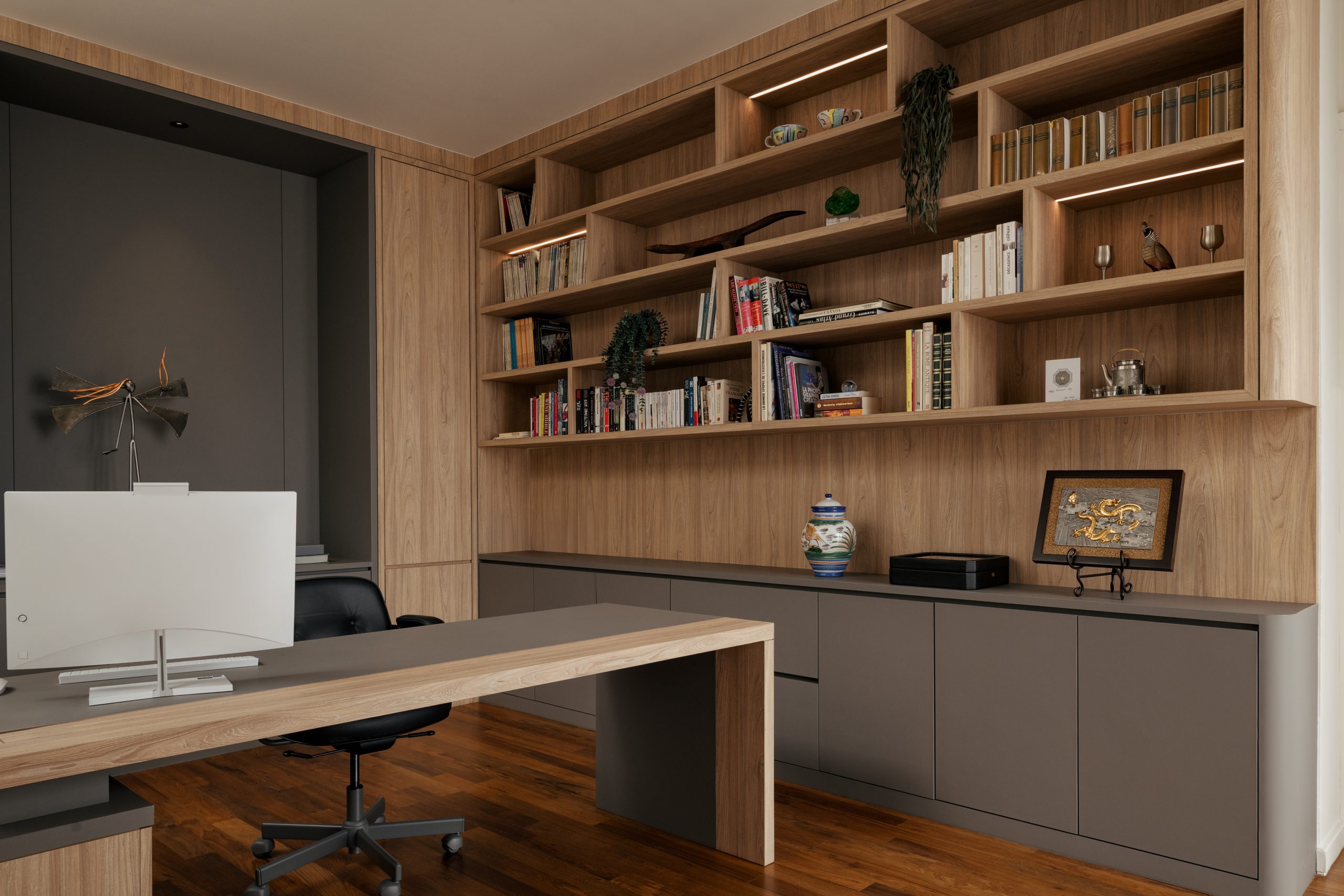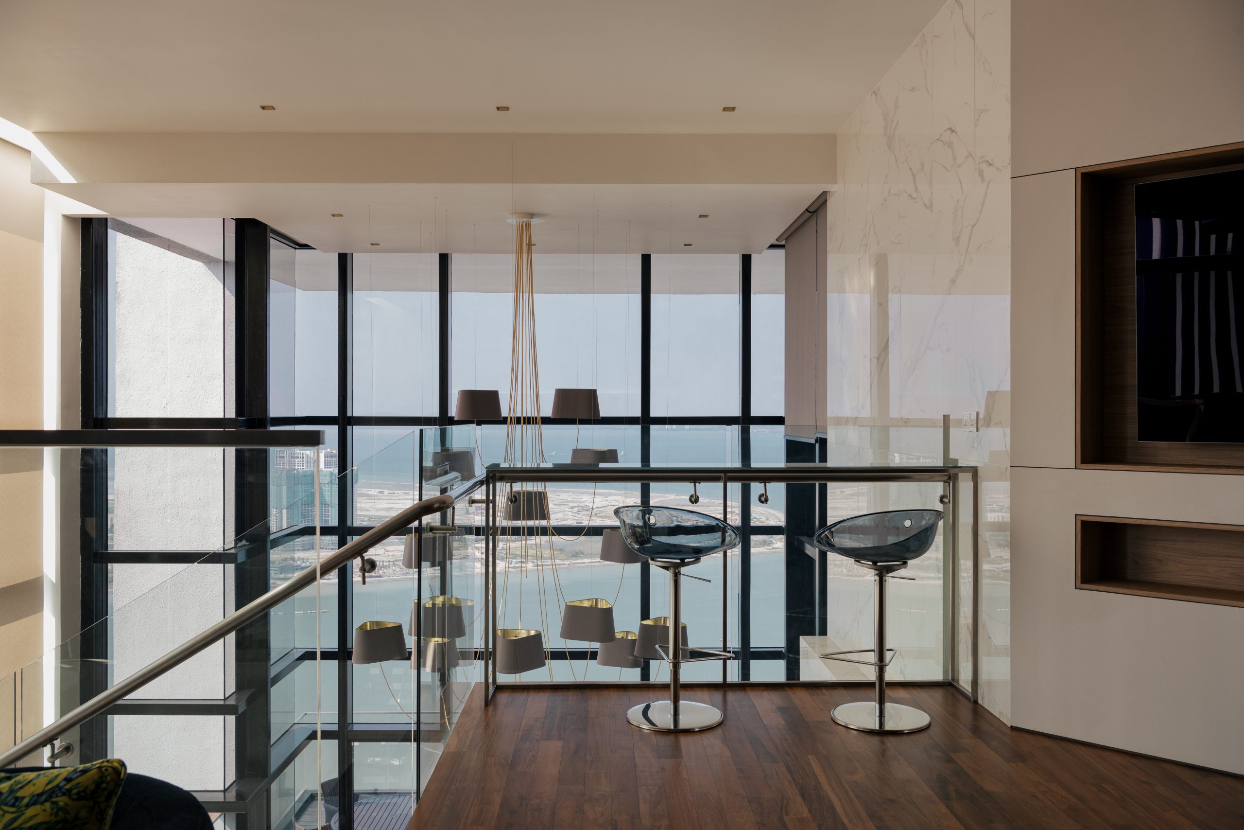 “Natural light filters through expansive glazing, highlighting the warmth of timber panels and sleek modern detailing. A sculptural pendant anchors the space with quiet sophistication, creating harmony between the space, people, and nature.” — Landart Interior