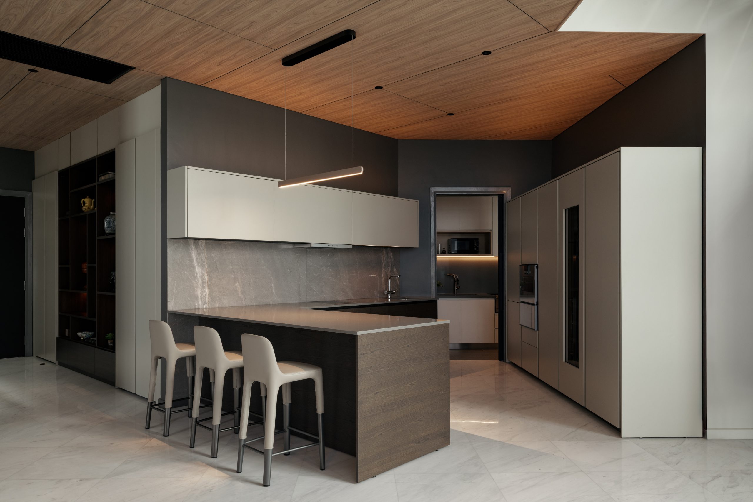 This modern kitchen combines clean lines with inviting warmth. Matte cabinetry, stone surfaces, and a timber ceiling create a harmonious palette of tones and textures while soft lighting and refined details convey understated sophistication and everyday elegance.
