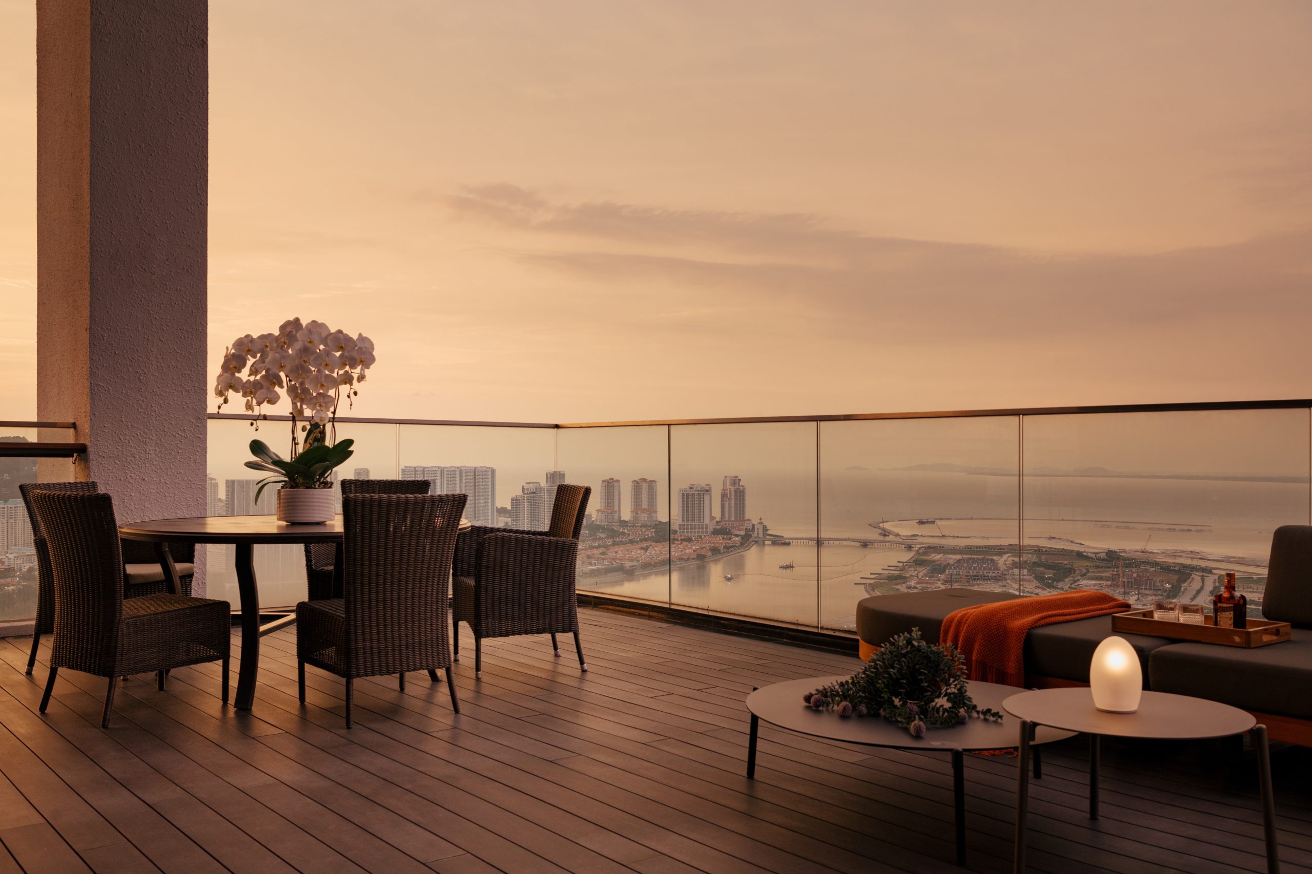 The lush outdoor setting provides inviting seating that transcends mere function, fostering intimacy, encouraging conversation and maximising space through thoughtful, well-crafted design framed by sweeping sea and city views. Warm sunset hues, gentle lighting and tactile furnishings create a tranquil retreat, seamlessly extending indoor comfort into the expansive horizon.