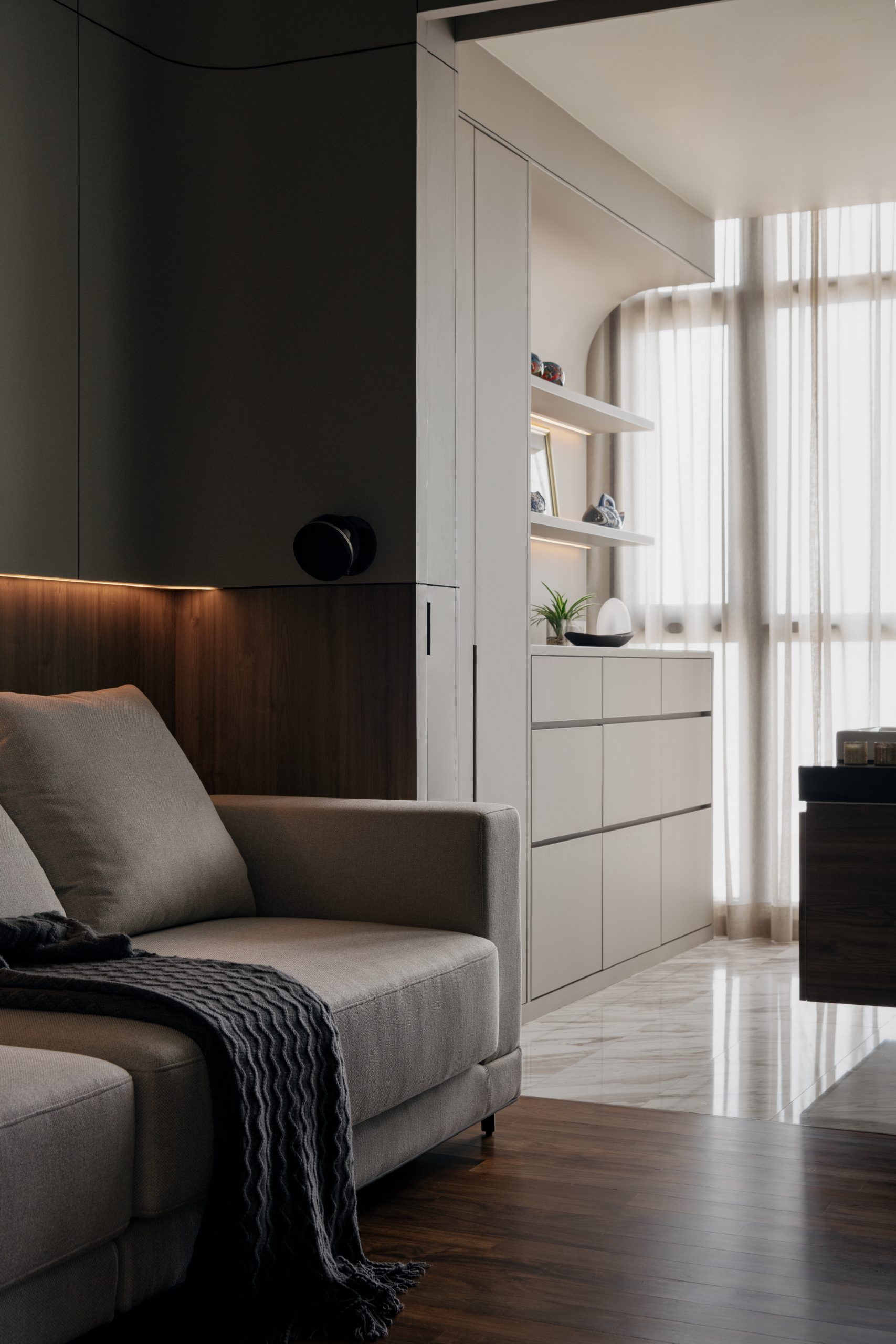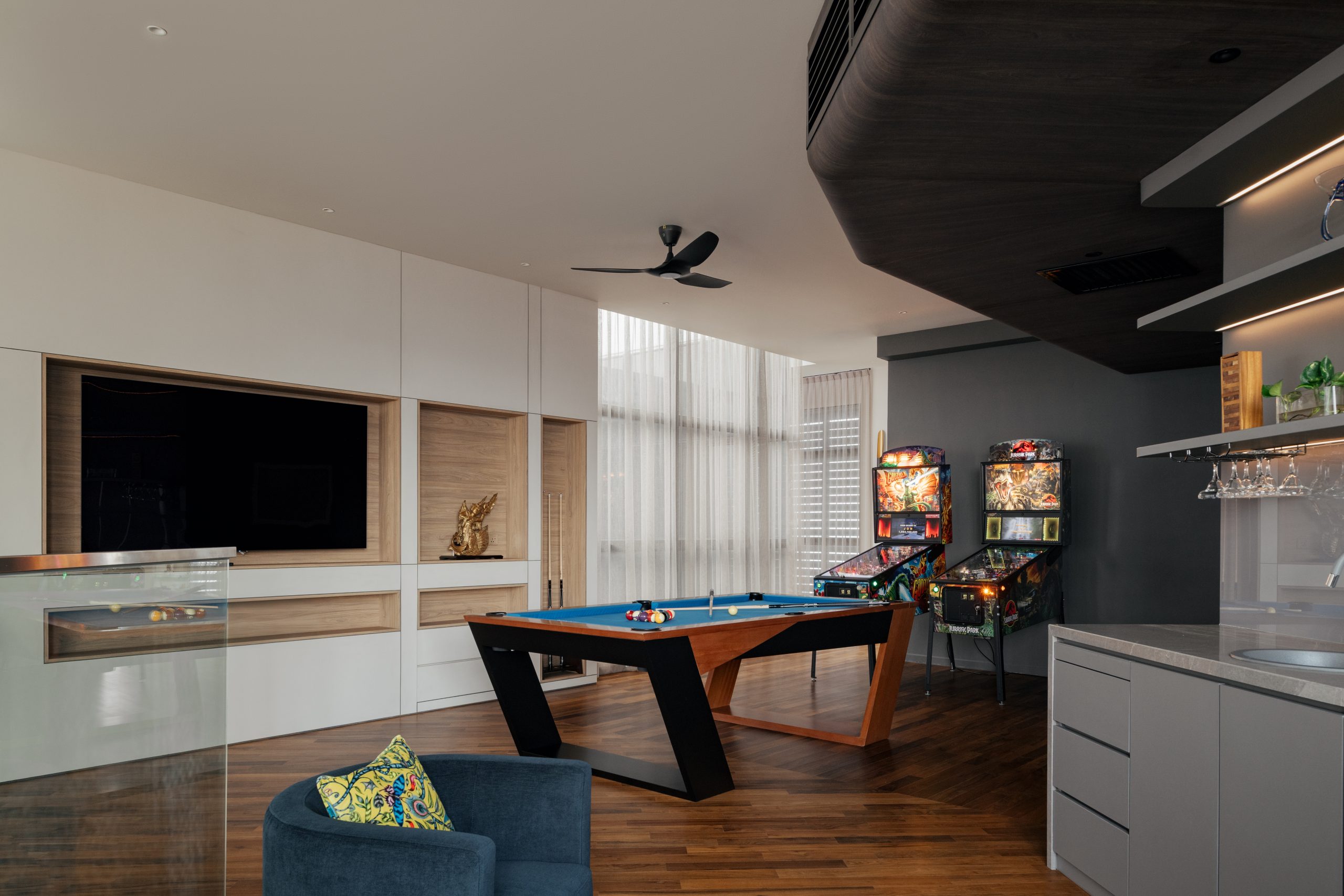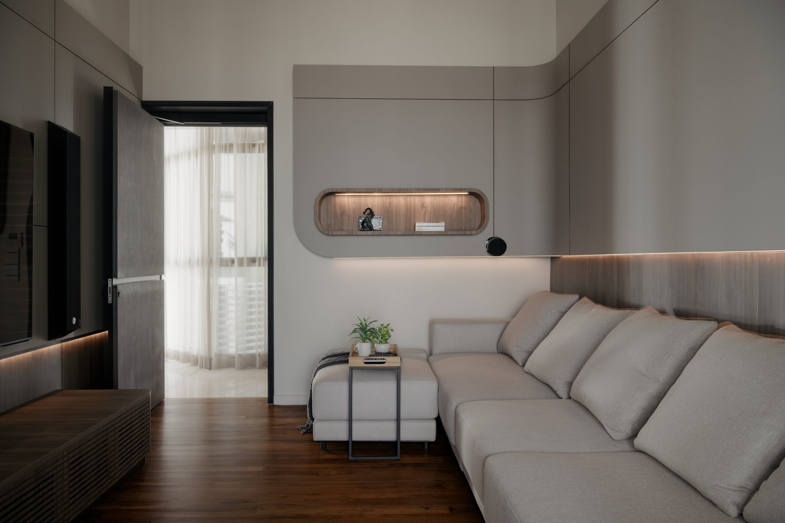 Combines refined minimalism with immersive comfort. Curved joinery and concealed lighting gently soften the space while warm timber flooring and plush seating create an intimate atmosphere, ideal for relaxation, entertainment and quiet retreat.