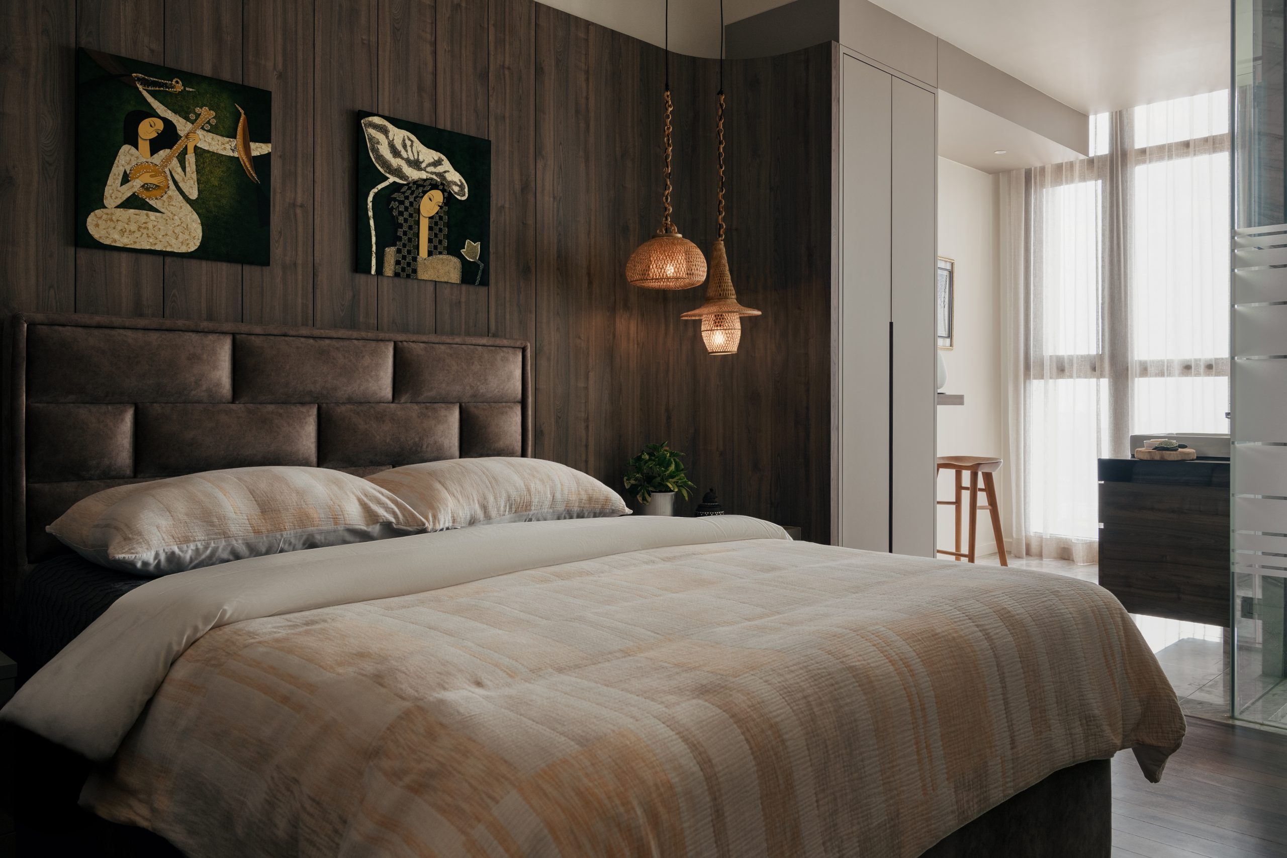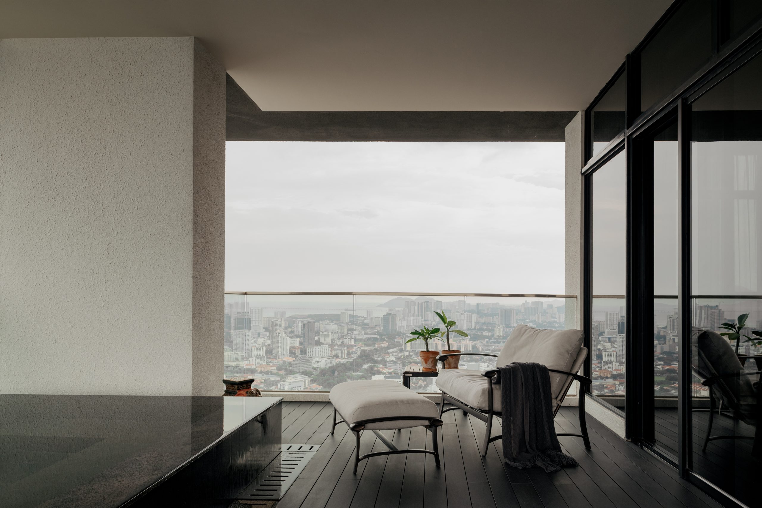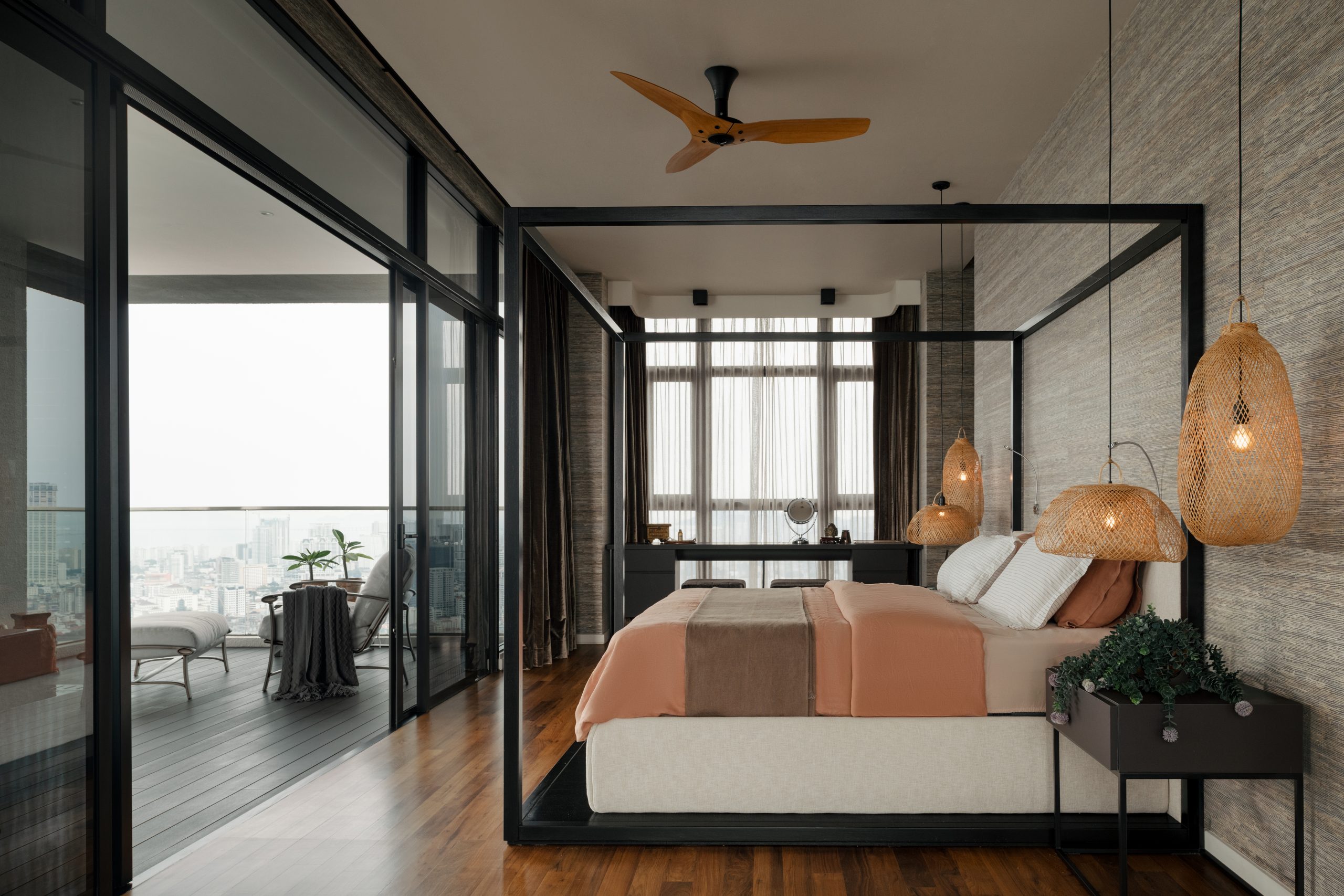 Exemplifies tropical modernism with a four-poster bed, bamboo pendant lamps and textured wall finishes that convey refined warmth. A private balcony with lounge seating offers sweeping views of the sea and city, creating a serene retreat that seamlessly blurs the boundaries between indoor comfort and the natural horizon.