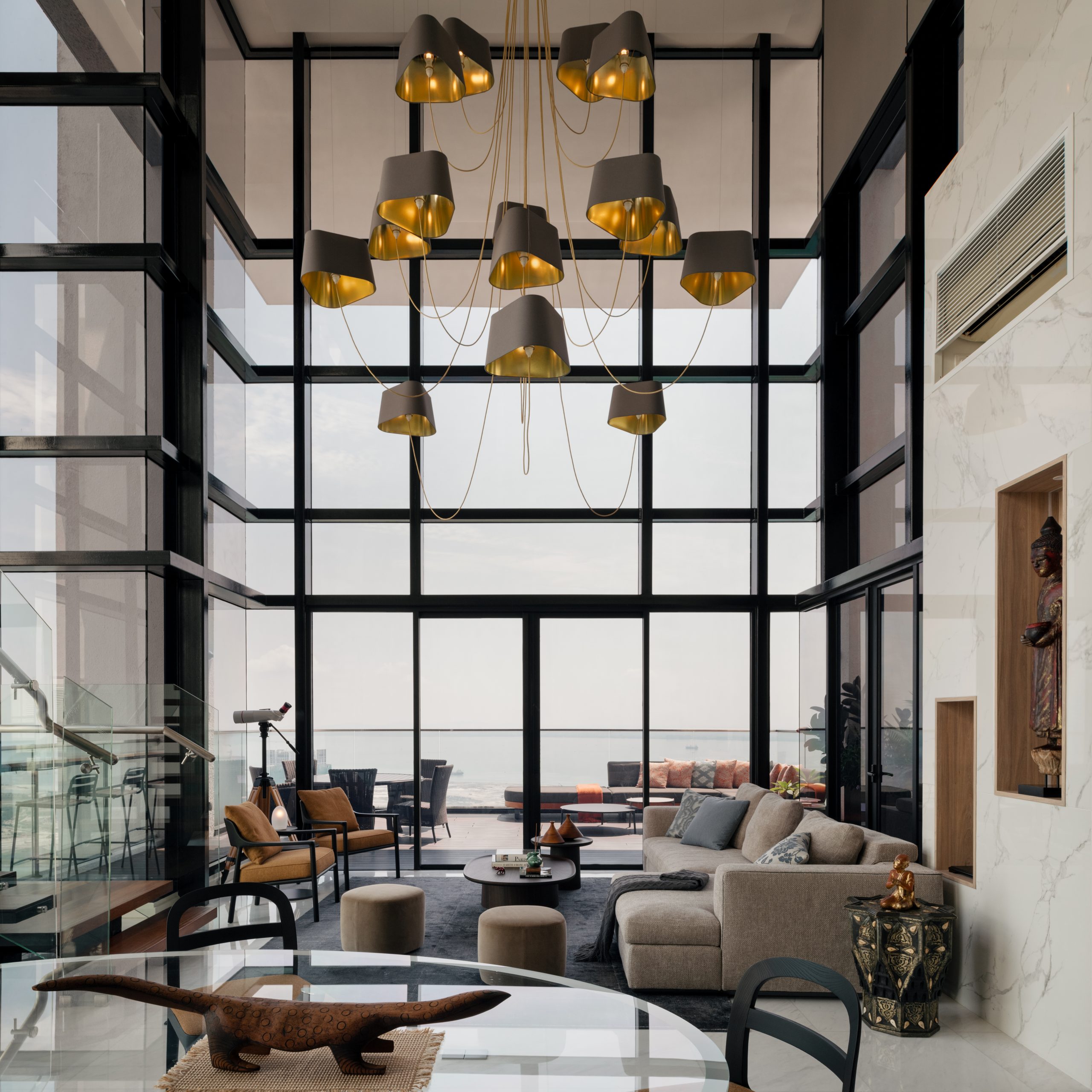 This Penang residence embodies tropical modernism with an open-plan layout that seamlessly connects the living, dining, and courtyard areas. Expansive glazing frames borrowed sea views, while a Nuage chandelier and Calacatta marble backdrop evoke quiet luxury. Warm timber tones, curated furnishings, and wellness-inspired amenities combine to create a serene retreat defined by understated elegance and a natural connection to the outdoors.
