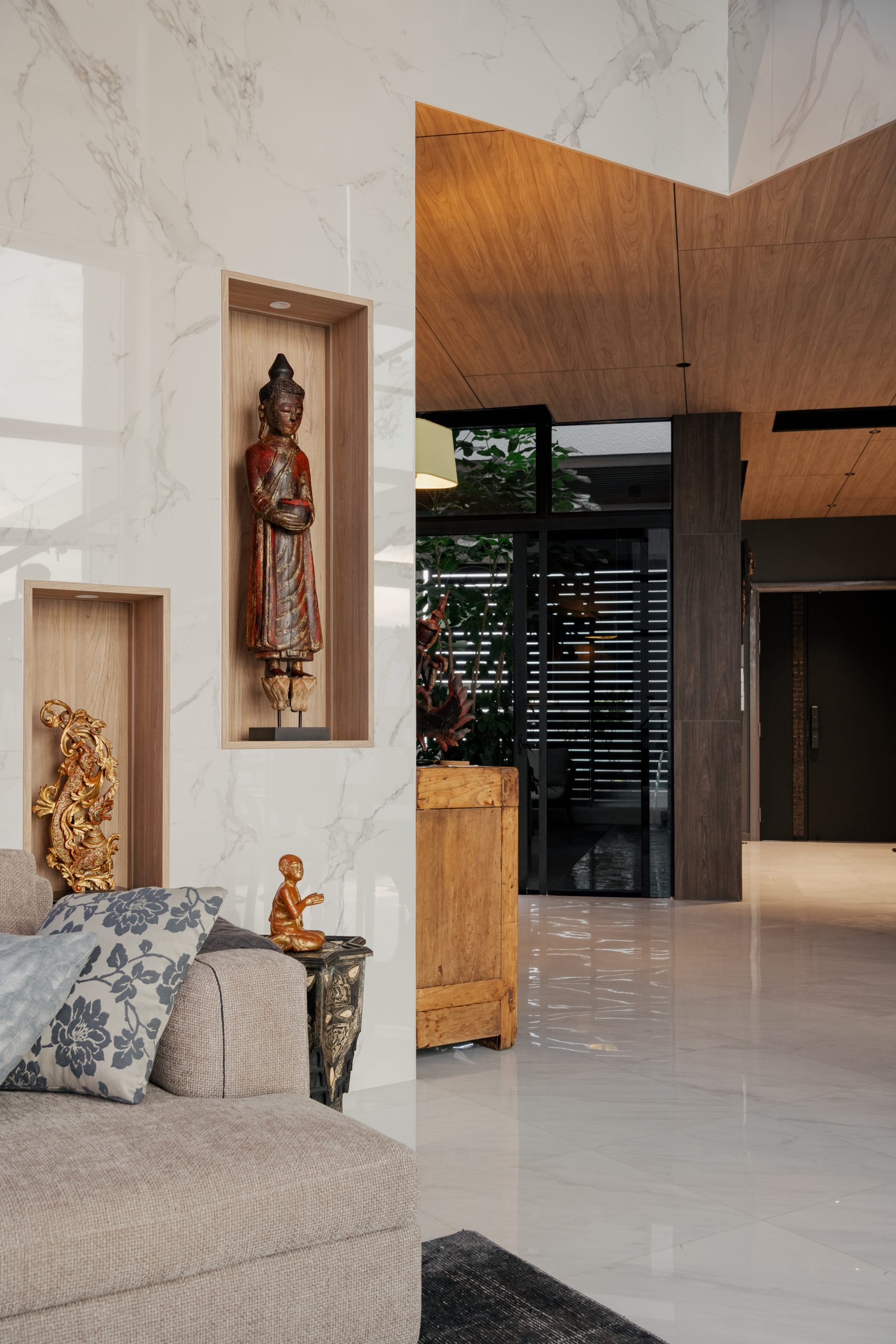 A harmonious balance of modern refinement and tropical warmth is achieved through the open-plan layout and expansive glazing, which invite sea views and abundant natural light. A Nuage chandelier, Calacatta marble backdrop, and rich timber accents provide sculptural elegance, while curated Italian furnishings evoke calm sophistication and a seamless fusion of art, craftsmanship, and contemporary living.
